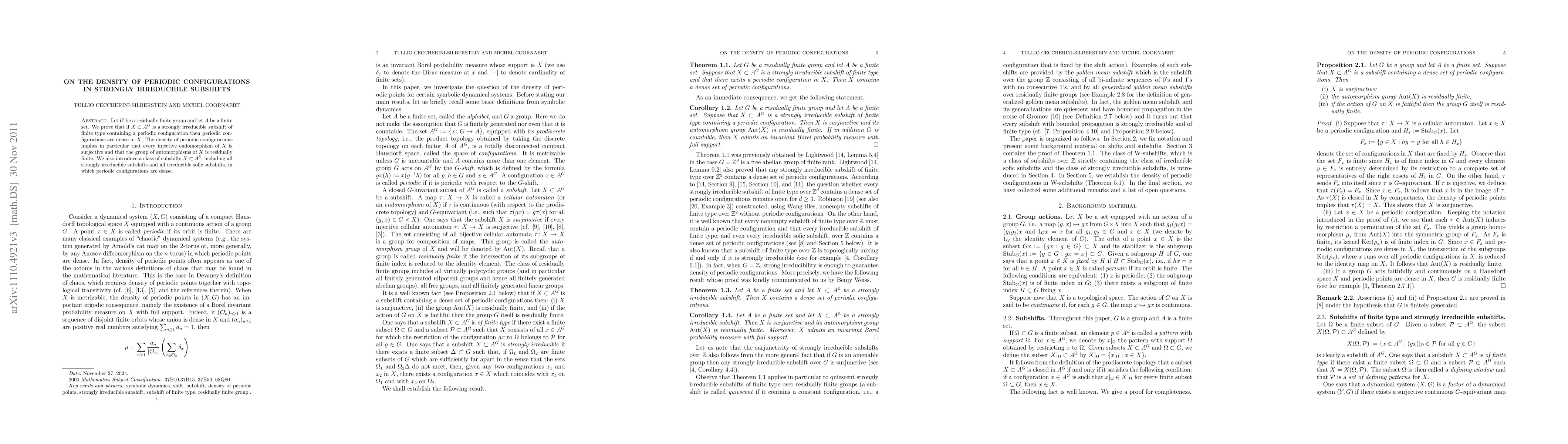 Let $G$ be a residually finite group and let $A$ be a finite set. We prove that if $X \subset A^G$ is a strongly irreducible subshift of finite type containing a periodic configuration then periodic configurations are dense in $X$. The density of periodic configurations implies in particular that every injective endomorphism of $X$ is surjective and that the group of automorphisms of $X$ is residually finite. We also introduce a class of subshifts $X \subset A^\Z$, including all strongly irreducible subshifts and all irreducible sofic subshifts, in which periodic configurations are dense.