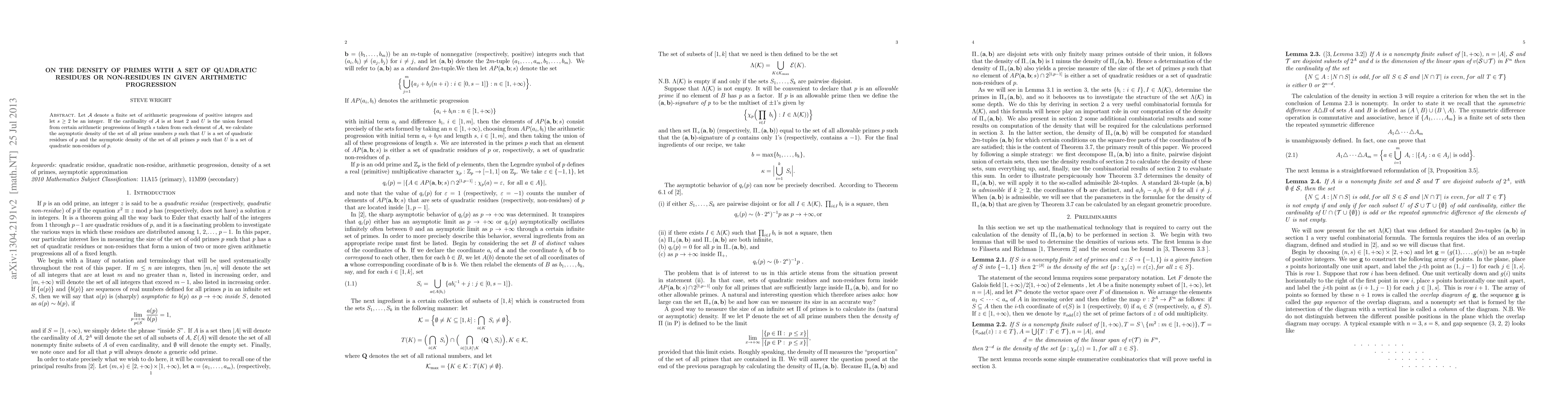 This paper investigates the asymptotic density of primes in arithmetic progressions where the residues are constrained to be quadratic residues or non-residues. It focuses on the union of specific arithmetic progressions and determines the density of primes satisfying these quadratic conditions.