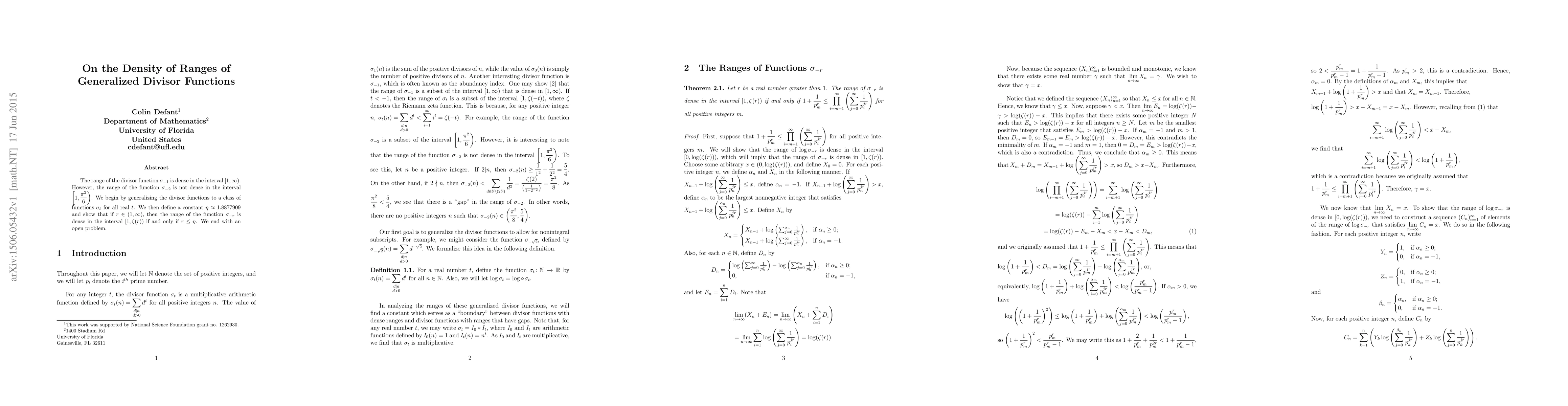 The range of the divisor function $\sigma_{-1}$ is dense in the interval $[1,\infty)$. However, the range of the function $\sigma_{-2}$ is not dense in the interval $\displaystyle{\left[1,\frac{\pi^2}{6}\right)}$. We begin by generalizing the divisor functions to a class of functions $\sigma_{t}$ for all real $t$. We then define a constant $\eta\approx 1.8877909$ and show that if $r\in(1,\infty)$, then the range of the function $\sigma_{-r}$ is dense in the interval $[1,\zeta(r))$ if and only if $r\leq\eta$. We end with an open problem.