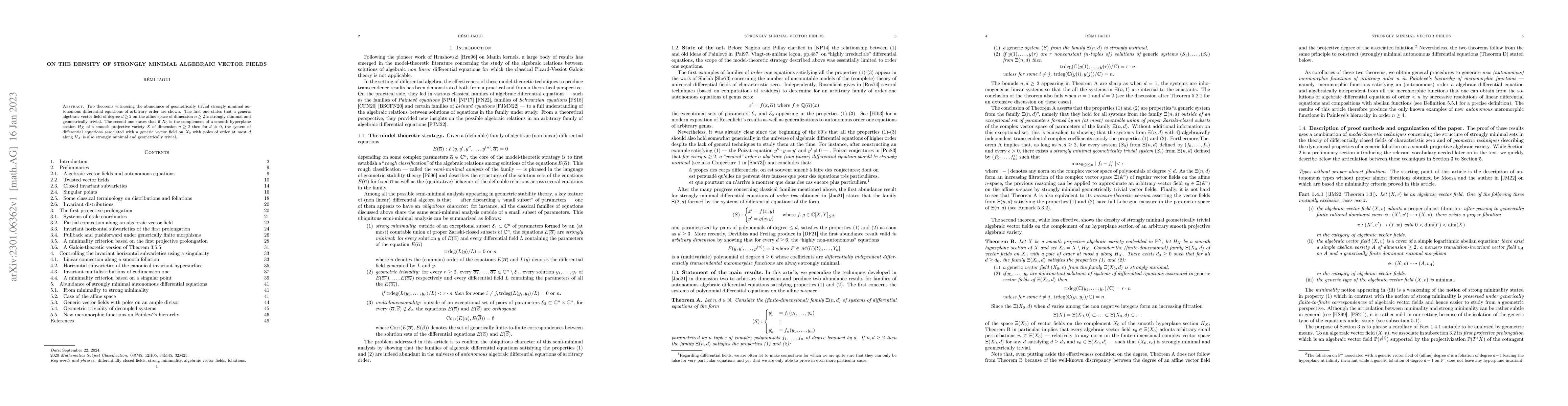 Two theorems witnessing the abundance of geometrically trivial strongly minimal autonomous differential equations of arbitrary order are shown. The first one states that a generic algebraic vector field of degree $d\geq 2$ on the affine space of dimension $n \geq 2$ is strongly minimal and geometrically trivial. The second one states that if $X_0$ is the complement of a smooth hyperplane section $H_X$ of a smooth projective variety $X$ of dimension $n \geq 2$ then for $d \gg 0$, the system of differential equations associated with a generic vector field on $X_0$ with poles of order at most $d$ along $H_X$ is also strongly minimal and geometrically trivial.