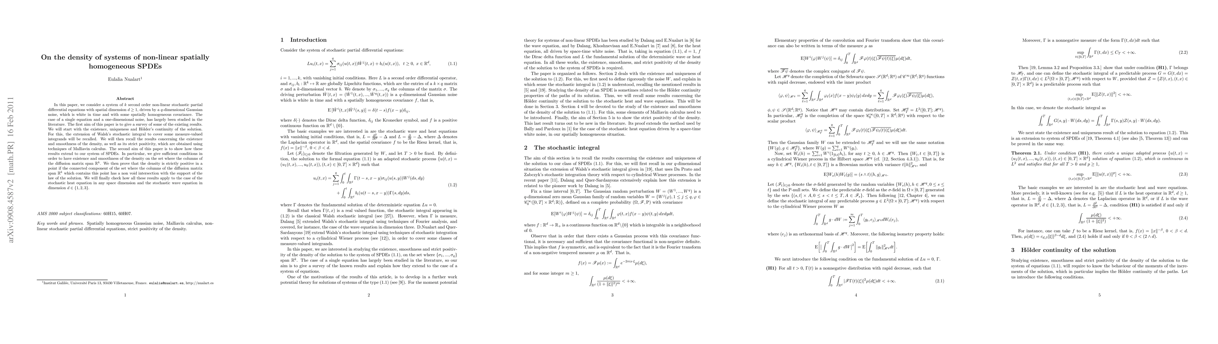 In this paper, we consider a system of $k$ second order non-linear stochastic partial differential equations with spatial dimension $d \geq 1$, driven by a $q$-dimensional Gaussian noise, which is white in time and with some spatially homogeneous covariance. The case of a single equation and a one-dimensional noise, has largely been studied in the literature. The first aim of this paper is to give a survey of some of the existing results. We will start with the existence, uniqueness and H\"older's continuity of the solution. For this, the extension of Walsh's stochastic integral to cover some measure-valued integrands will be recalled. We will then recall the results concerning the existence and smoothness of the density, as well as its strict positivity, which are obtained using techniques of Malliavin calculus. The second aim of this paper is to show how these results extend to our system of SPDEs. In particular, we give sufficient conditions in order to have existence and smoothness of the density on the set where the columns of the diffusion matrix span $\R^k$. We then prove that the density is strictly positive in a point if the connected component of the set where the columns of the diffusion matrix span $\R^k$ which contains this point has a non void intersection with the support of the law of the solution. We will finally check how all these results apply to the case of the stochastic heat equation in any space dimension and the stochastic wave equation in dimension $d\in \{1,2,3\}$.