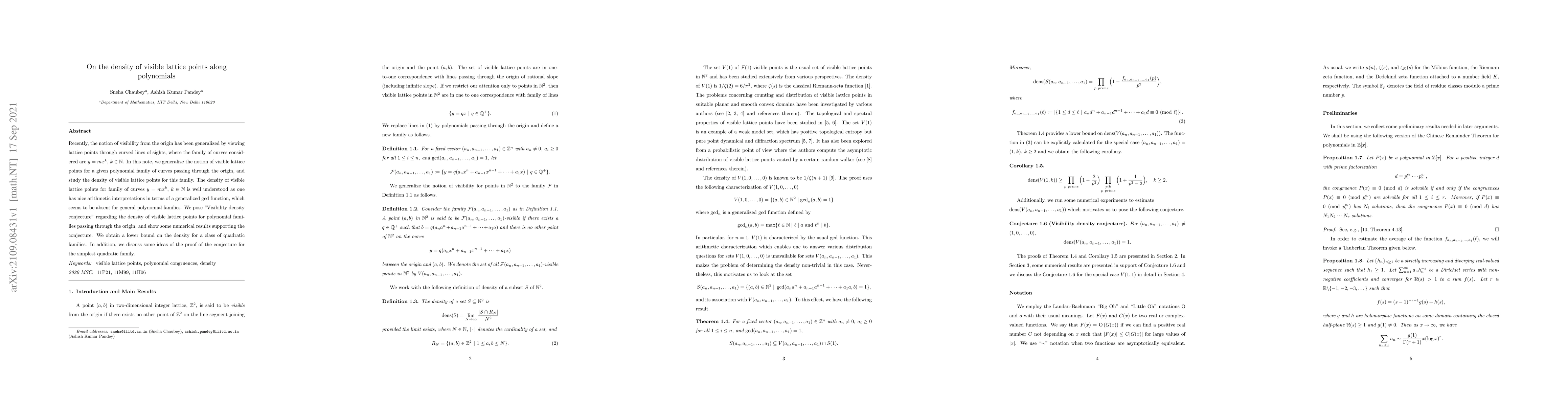 Recently, the notion of visibility from the origin has been generalized by viewing lattice points through curved lines of sights, where the family of curves considered are $y=mx^k$, $k\in\mathbb{N}$. In this note, we generalize the notion of visible lattice points for a given polynomial family of curves passing through the origin, and study the density of visible lattice points for this family. The density of visible lattice points for family of curves $y=mx^k$, $k\in\mathbb{N}$ is well understood as one has nice arithmetic interpretations in terms of a generalized gcd function, which seems to be absent for general polynomial families. We pose "Visibility density conjecture" regarding the density of visible lattice points for polynomial families passing through the origin, and show some numerical results supporting the conjecture. We obtain a lower bound on the density for a class of quadratic families. In addition, we discuss some ideas of the proof of the conjecture for the simplest quadratic family.