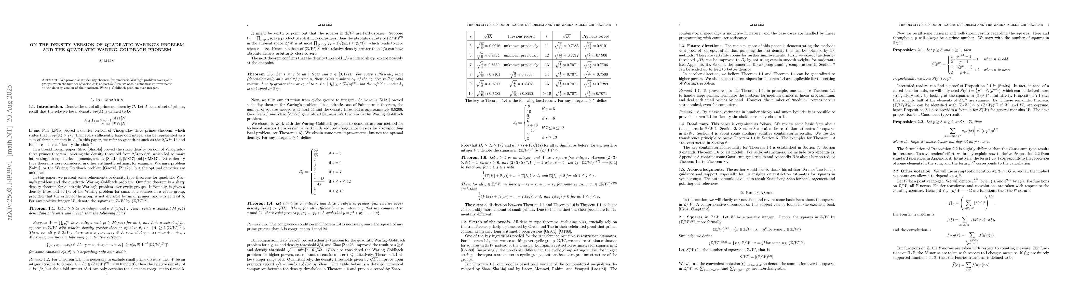 We prove a sharp density theorem for quadratic Waring's problem over cyclic groups, when the number of variables is at least $5$. Also, we obtain some new improvements on the density version of the quadratic Waring--Goldbach problem over integers.
