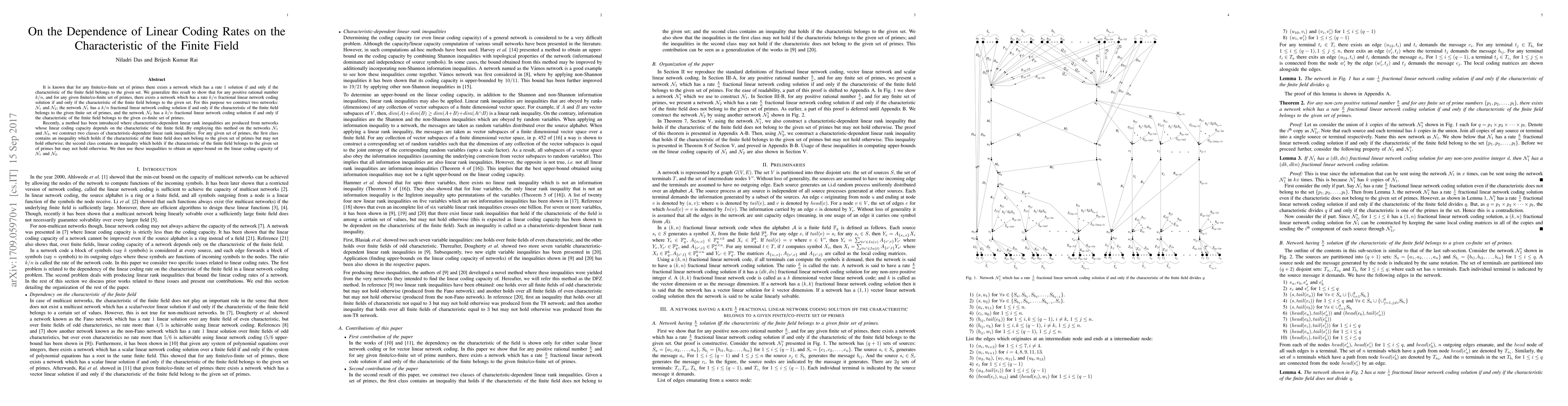 It is known that for any finite/co-finite set of primes there exists a network which has a rate $1$ solution if and only if the characteristic of the finite field belongs to the given set. We generalize this result to show that for any positive rational number $k/n$, and for any given finite/co-finite set of primes, there exists a network which has a rate $k/n$ fractional linear network coding solution if and only if the characteristic of the finite field belongs to the given set. For this purpose we construct two networks: $\mathcal{N}_1$ and $\mathcal{N}_2$; the network $\mathcal{N}_1$ has a $k/n$ fractional linear network coding solution if and only if the characteristic of the finite field belongs to the given finite set of primes, and the network $\mathcal{N}_2$ has a $k/n$ fractional linear network coding solution if and only if the characteristic of the finite field belongs to the given co-finite set of primes. Recently, a method has been introduced where characteristic-dependent linear rank inequalities are produced from networks whose linear coding capacity depends on the characteristic of the finite field. By employing this method on the networks $\mathcal{N}_1$ and $\mathcal{N}_2$, we construct two classes of characteristic-dependent linear rank inequalities. For any given set of primes, the first class contains an inequality which holds if the characteristic of the finite field does not belong to the given set of primes but may not hold otherwise; the second class contains an inequality which holds if the characteristic of the finite field belongs to the given set of primes but may not hold otherwise. We then use these inequalities to obtain an upper-bound on the linear coding capacity of $\mathcal{N}_1$ and $\mathcal{N}_2$.