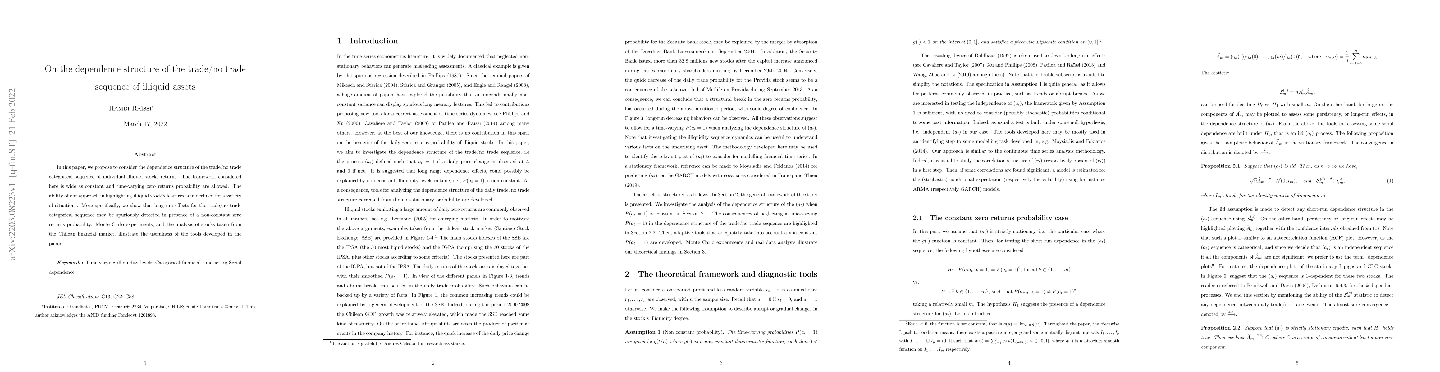In this paper, we propose to consider the dependence structure of the trade/no trade categorical sequence of individual illiquid stocks returns. The framework considered here is wide as constant and time-varying zero returns probability are allowed. The ability of our approach in highlighting illiquid stock's features is underlined for a variety of situations. More specifically, we show that long-run effects for the trade/no trade categorical sequence may be spuriously detected in presence of a non-constant zero returns probability. Monte Carlo experiments, and the analysis of stocks taken from the Chilean financial market, illustrate the usefulness of the tools developed in the paper.