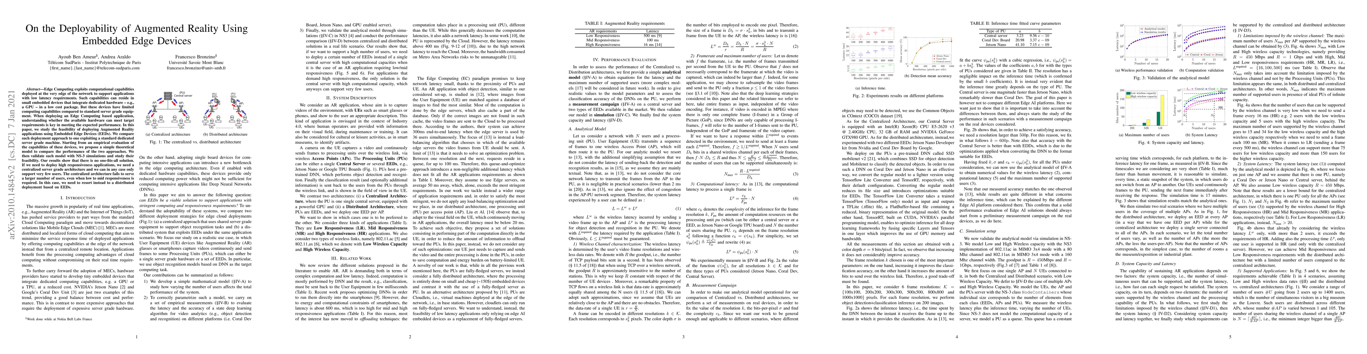 This paper investigates the feasibility of deploying Augmented Reality applications using Embedded Edge Devices (EEDs) versus a centralized server. It finds that while EEDs are suitable for low to mid responsiveness applications, a centralized server is necessary for high responsiveness but struggles to support many users.