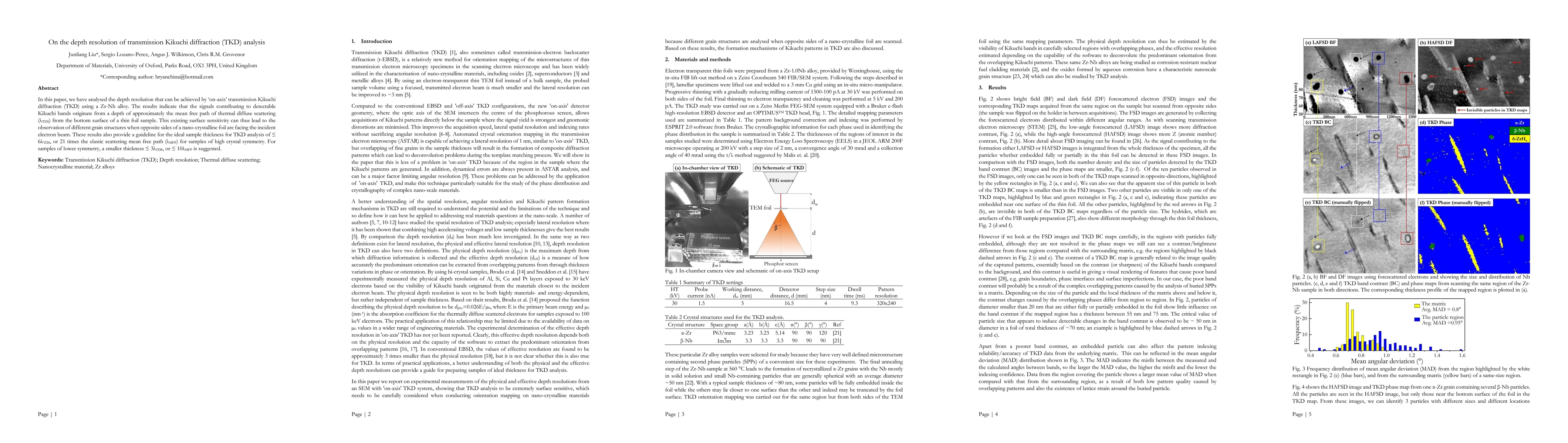 This paper investigates the depth resolution of on-axis transmission Kikuchi diffraction (TKD) using a Zr-Nb alloy, finding that detectable Kikuchi bands originate from a depth of approximately the mean free path of thermal diffuse scattering. Guidelines for ideal sample thickness are provided, recommending 6λTDS for high crystal symmetry samples and 3λTDS for lower symmetry samples.