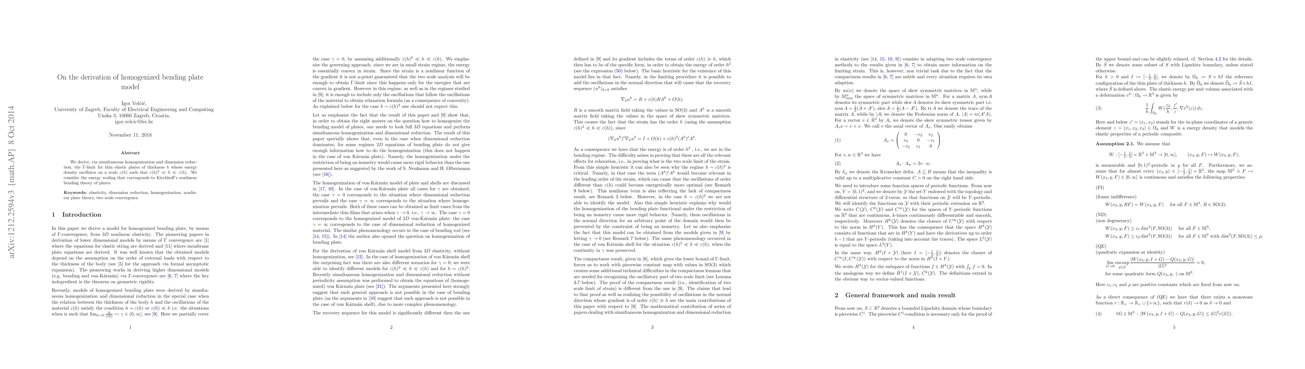 This paper derives a $\Gamma$-limit for thin elastic plates using simultaneous homogenization and dimension reduction, focusing on the energy density oscillating on a smaller scale than the plate thickness, within the context of Kirchhoff's nonlinear bending theory.