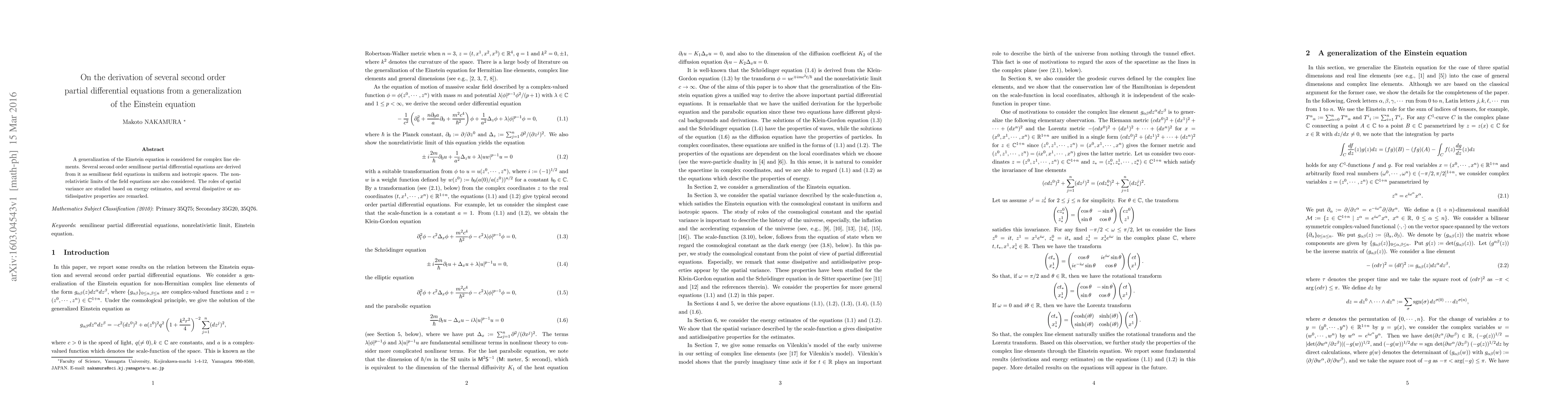 A generalization of the Einstein equation is considered for complex line elements. Several second order semilinear partial differential equations are derived from it as semilinear field equations in uniform and isotropic spaces. The nonrelativistic limits of the field equations are also considered. The roles of spatial variance are studied based on energy estimates,and several dissipative or antidissipative properties are remarked.