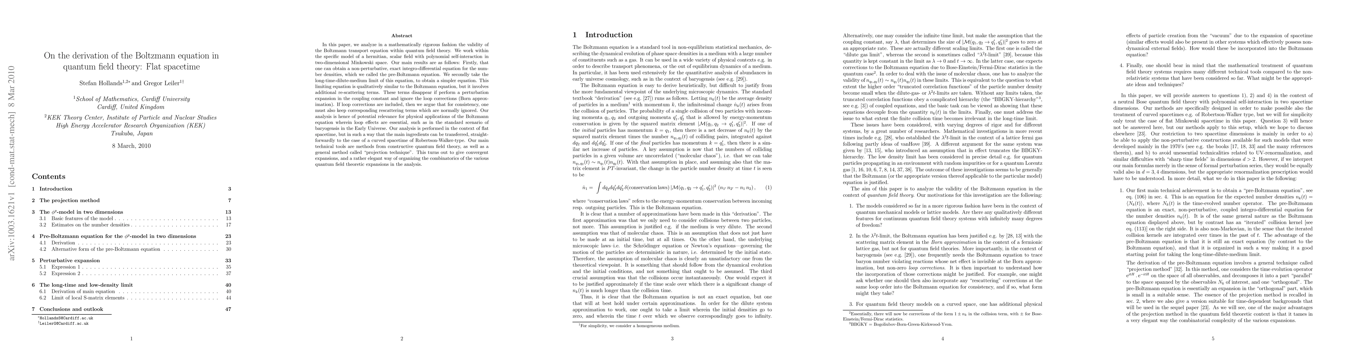 This paper rigorously derives the Boltzmann transport equation in quantum field theory for a scalar field in flat spacetime, obtaining a pre-Boltzmann equation and showing that it simplifies to a form similar to the Boltzmann equation with additional rescattering terms under certain approximations. The analysis is relevant for scenarios like baryogenesis where loop corrections are significant.