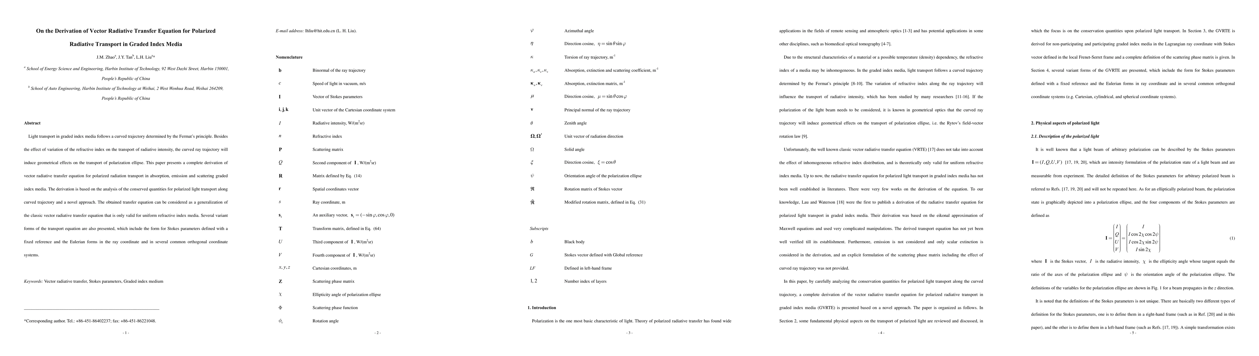 This paper derives a vector radiative transfer equation for polarized light in graded index media, considering both the refractive index variation and geometrical effects on polarization. The novel approach generalizes the classic equation, valid for uniform media, and presents several forms including those for Stokes parameters and Eulerian forms in different coordinate systems.