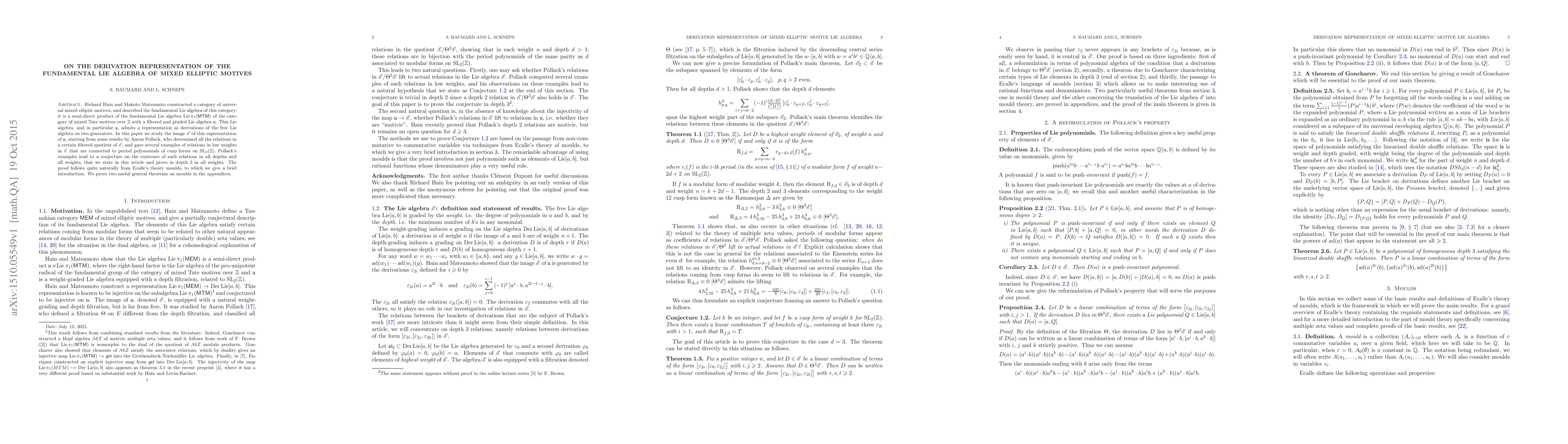 Richard Hain and Makoto Matsumoto constructed a category of universal mixed elliptic motives, and described the fundamental Lie algebra of this category: it is a semi-direct product of the fundamental Lie algebra Lie$\,\pi_1(MTM)$ of the category of mixed Tate motives over ${\bf Z}$ with a filtered and graded Lie algebra $u$. This Lie algebra, and in particular the subspace $u$, admits a representation as derivations of the free Lie algebra on two generators. In this paper we study the image $E$ of this representation of $u$, starting from some results by Aaron Pollack, who determined all the relations in a certain filtered quotient of $E$, and gave several examples of relations in low weights in $E$ that are connected to period polynomials of cusp forms on $SL_2({\bf Z})$. Pollack's examples lead to a conjecture on the existence of such relations in all depths and all weights, that we state in this article and prove in depth 3 in all weights. The proof follows quite naturally from Ecalle's theory moulds, to which we give a brief introduction. We prove two useful general theorems on moulds in the appendices.