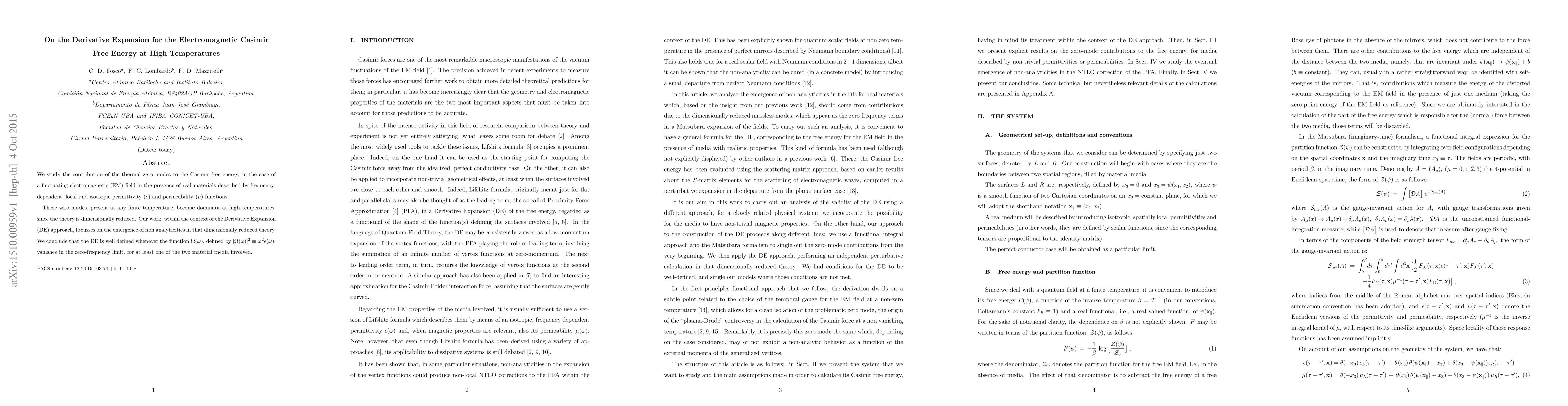This paper investigates the thermal zero modes' contribution to the electromagnetic Casimir free energy in high-temperature scenarios, focusing on fluctuating EM fields in materials with frequency-dependent permittivity and permeability. It concludes that the Derivative Expansion approach is valid when $\Omega(\omega)$ vanishes at zero frequency for at least one material medium.