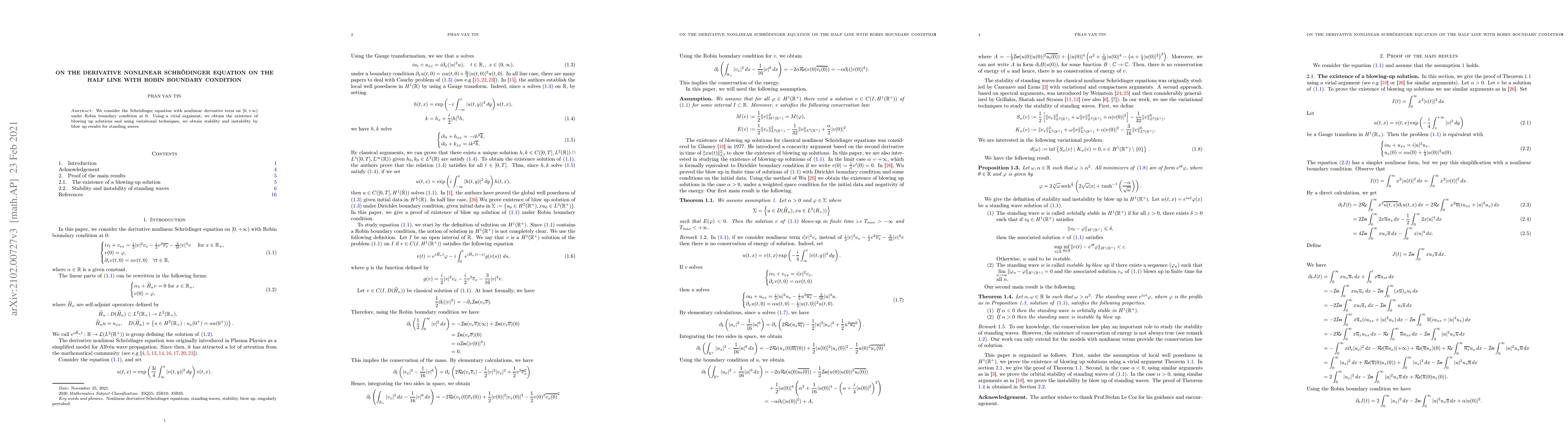 Summary: This paper investigates the nonlinear derivative Schrödinger equation on the half line with Robin boundary conditions, proving the existence of blowing up solutions via a virial argument and analyzing the stability and instability of standing waves using variational techniques.