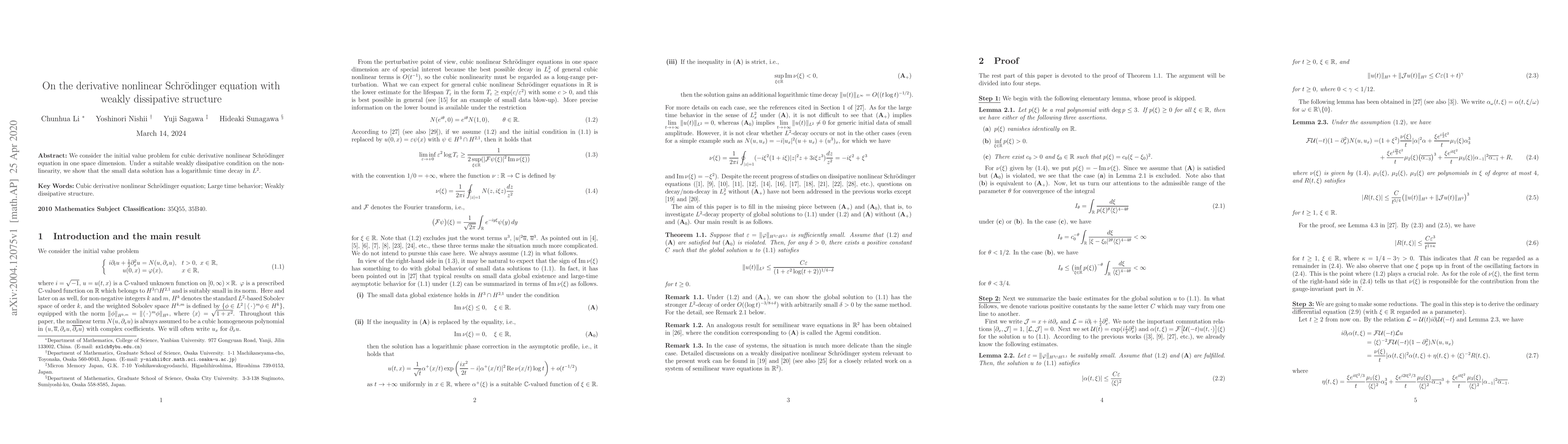 Summary: This paper investigates the cubic derivative nonlinear Schrödinger equation in one dimension, proving that under a weakly dissipative nonlinearity, small data solutions exhibit logarithmic time decay in the $L^2$ norm.