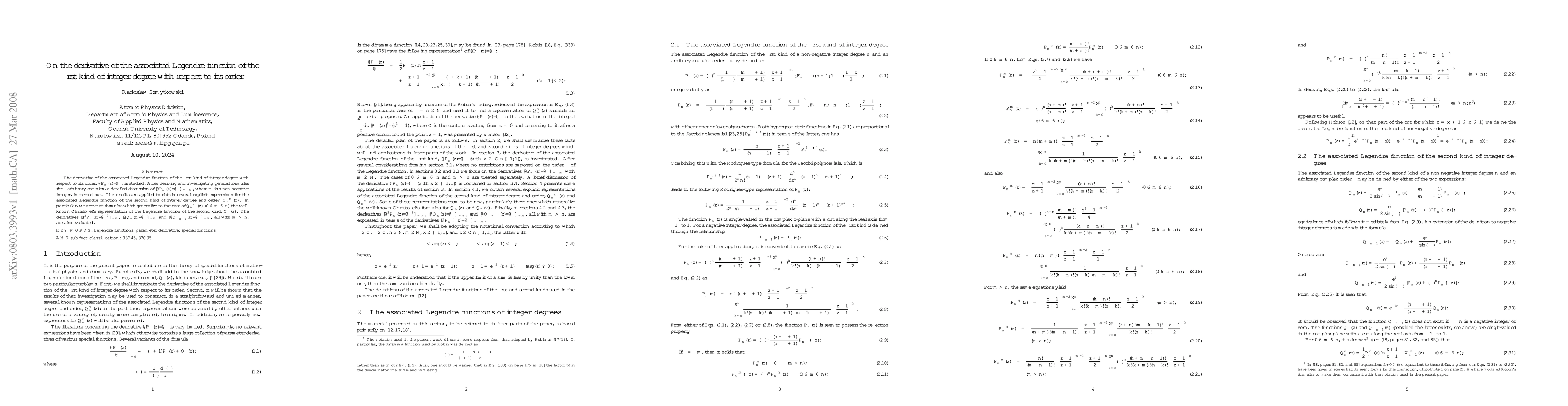 This paper studies the derivative of the associated Legendre function of the first kind with respect to its order, deriving general formulas for complex $\mu$ and focusing on $[\partial P_{n}^{\mu}(z)/\partial\mu]_{\mu=\pm m}$. It also provides explicit expressions for the associated Legendre function of the second kind, $Q_{n}^{\pm m}(z)$, generalizing Christoffel's representation. Additionally, it evaluates higher-order derivatives involving $Q_{n}^{\mu}(z)$ and $Q_{-n-1}^{\mu}(z)$.