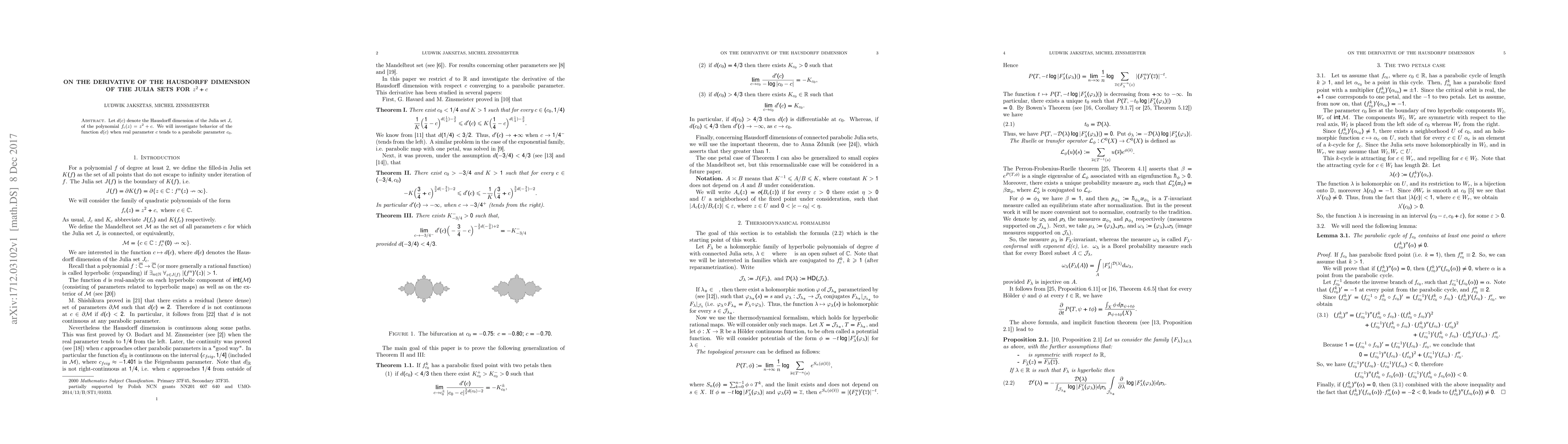 Let $d(c)$ denote the Hausdorff dimension of the Julia set $J_c$ of the polynomial $f_c(z)=z^2+c$. We will investigate behavior of the function $d(c)$ when real parameter $c$ tends to a parabolic parameter.