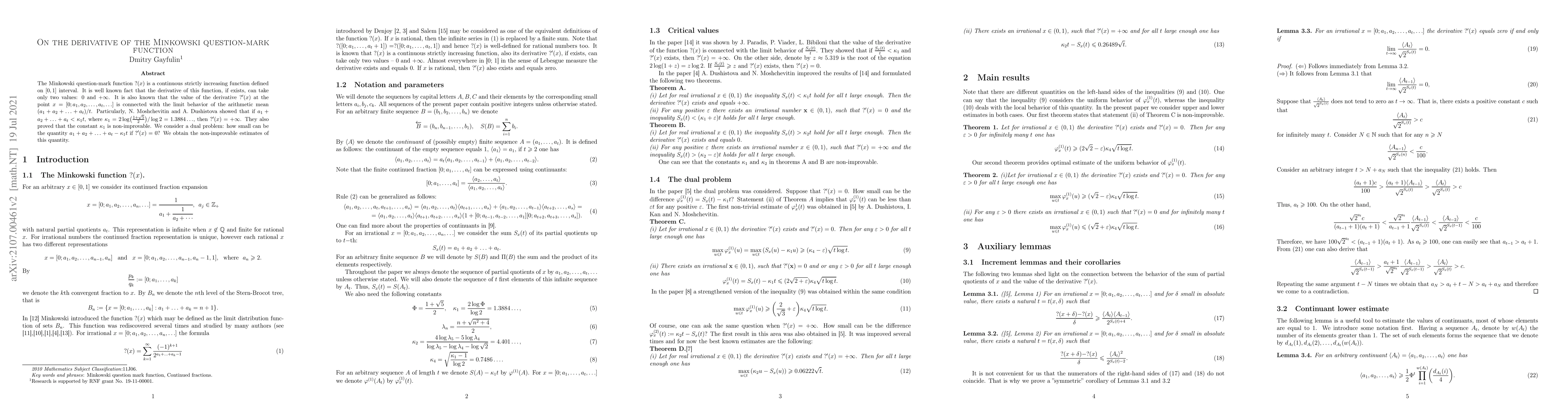 The Minkowski question-mark function $?(x)$ is a continuous strictly increasing function defined on $[0,1]$ interval. It is well known fact that the derivative of this function, if exists, can take only two values: $0$ and $+\infty$. It is also known that the value of the derivative $?'(x)$ at the point $x=[0;a_1,a_2,\ldots,a_t,\ldots]$ is connected with the limit behavior of the arithmetic mean $(a_1+a_2+\ldots+a_t)/t$. Particularly, N. Moshchevitin and A. Dushistova showed that if $a_1+a_2+\ldots+a_t<\kappa_1 t$, where $\kappa_1 = 2\log\bigl({\frac{1+\sqrt{5}}{2}}\bigr)/\log{2}= 1.3884\ldots$, then $?'(x)=+\infty$. They also proved that the constant $\kappa_1$ is non-improvable. We consider a dual problem: how small can be the quantity $a_1+a_2+\ldots+a_t-\kappa_1 t$ if $?'(x)=0$? We obtain the non-improvable estimates of this quantity.