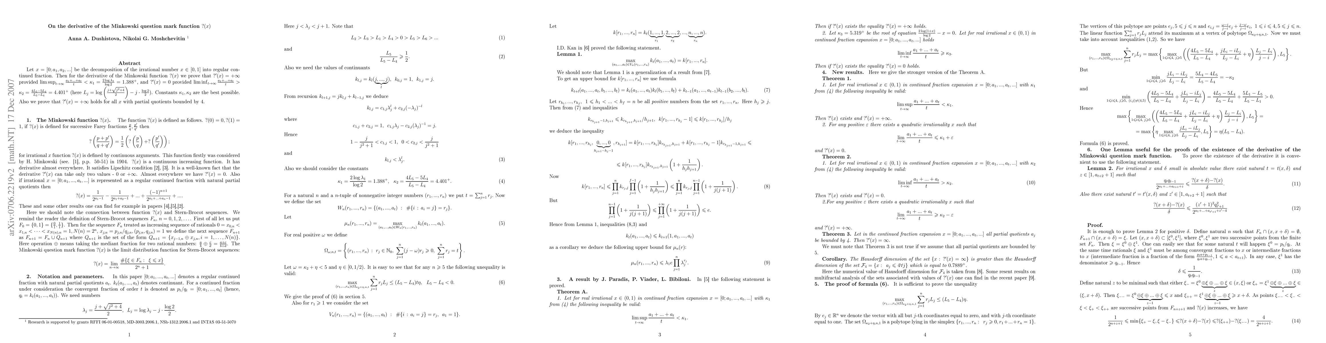 Let $ x = [0;a_1,a_2,...]$ be the decomposition of the irrational number $x \in [0,1]$ into regular continued fraction. Then for the derivative of the Minkowski function $?(x)$ we prove that $?'(x) = +\infty$ provided $ \limsup_{t\to \infty}\frac{a_1+...+a_t}{t} <\kappa_1 =\frac{2\log \lambda_1}{\log 2} = 1.388^+$, and $?'(x) = 0$ provided $ \liminf_{t\to \infty}\frac{a_1+...+a_t}{t} >\kappa_2 = \frac{4L_5-5L_4}{L_5-L_4}= 4.401^+$ (here $ L_j = \log (\frac{j+\sqrt{j^2+4}}{2}) - j\cdot\frac{\log 2}{2}$). Constants $\kappa_1,\kappa_2$ are the best possible. Also we prove that $?'(x) = +\infty$ holds for all $x$ with partial quotients bounded by 4.