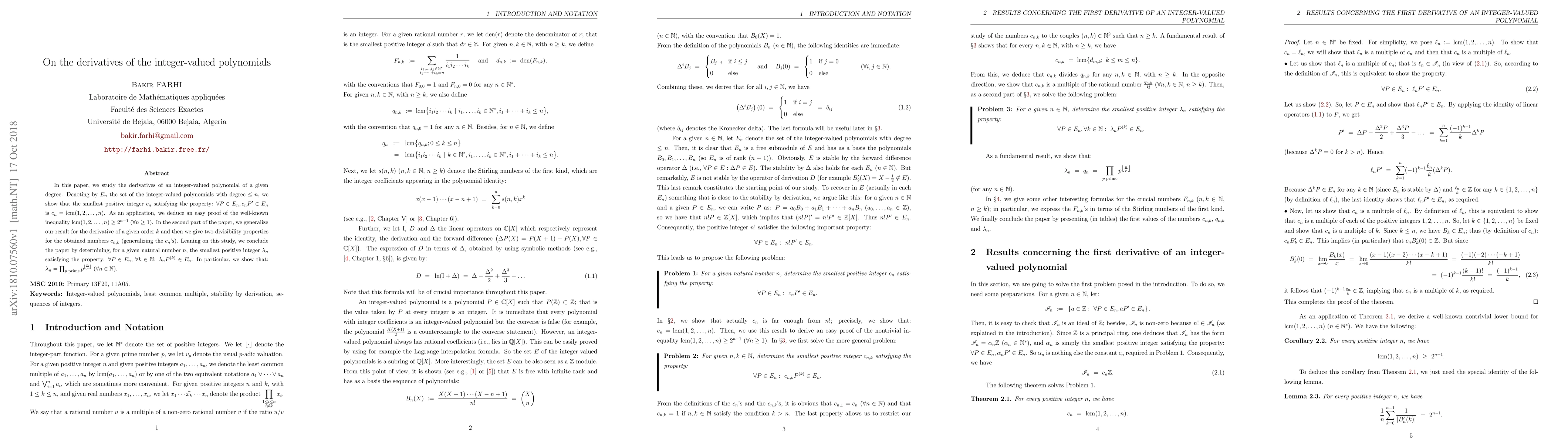 In this paper, we study the derivatives of an integer-valued polynomial of a given degree. Denoting by $E_n$ the set of the integer-valued polynomials with degree $\leq n$, we show that the smallest positive integer $c_n$ satisfying the property: $\forall P \in E_n, c_n P' \in E_n$ is $c_n = \mathrm{lcm}(1 , 2 , \dots , n)$. As an application, we deduce an easy proof of the well-known inequality $\mathrm{lcm}(1 , 2 , \dots , n) \geq 2^{n - 1}$ ($\forall n \geq 1$). In the second part of the paper, we generalize our result for the derivative of a given order $k$ and then we give two divisibility properties for the obtained numbers $c_{n , k}$ (generalizing the $c_n$'s). Leaning on this study, we conclude the paper by determining, for a given natural number $n$, the smallest positive integer $\lambda_n$ satisfying the property: $\forall P \in E_n$, $\forall k \in \mathbb{N}$: $\lambda_n P^{(k)} \in E_n$. In particular, we show that: $\lambda_n = \prod_{p \text{ prime}} p^{\lfloor\frac{n}{p}\rfloor}$ ($\forall n \in \mathbb{N}$).