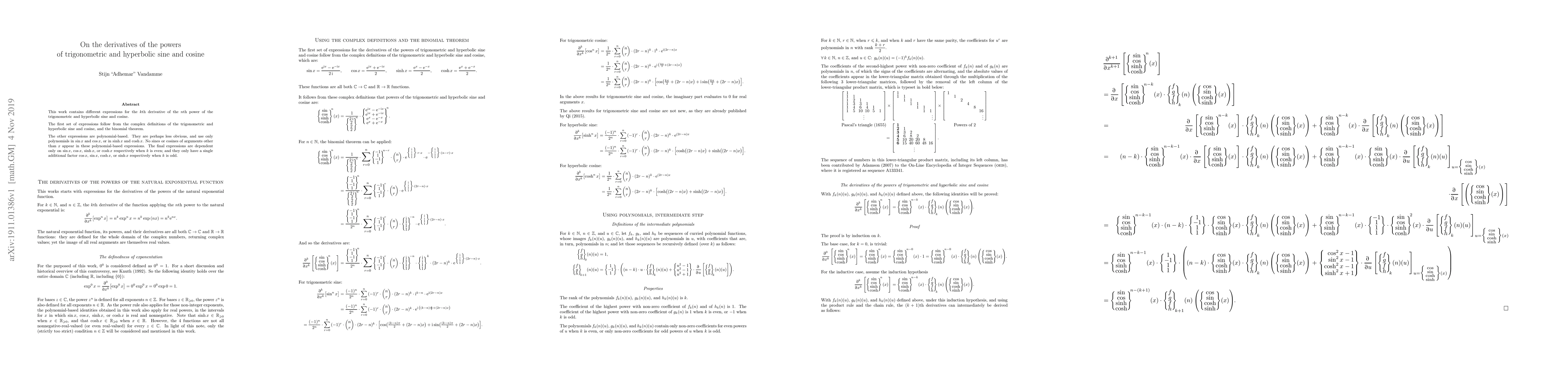 This paper derives expressions for the k'th derivative of the n'th power of trigonometric and hyperbolic sine and cosine, using both complex definitions and polynomial-based methods, with the latter relying solely on sin(x), cos(x), sinh(x), or cosh(x) depending on the parity of k.