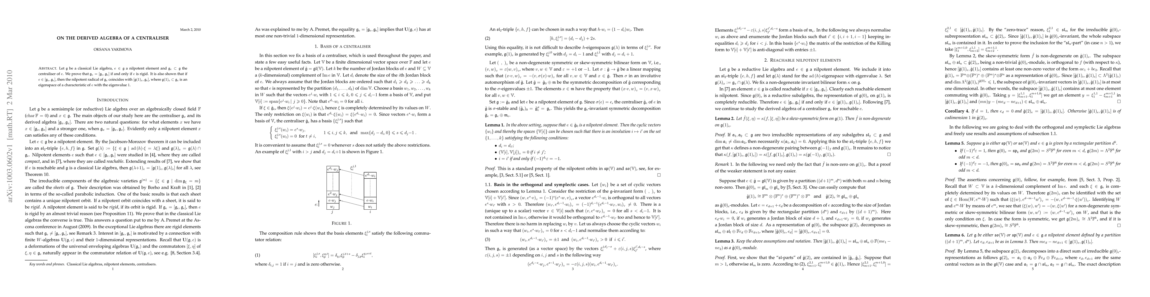 This paper explores properties of classical Lie algebras, proving that for a nilpotent element 'e' in a Lie algebra 'g', the centraliser 'g_e' equals its derived algebra '[g_e, g_e]' if and only if 'e' is rigid. Furthermore, if 'e' is within '[g_e, g_e]', the nilpotent radical of 'g_e' matches '[g(1)_e, g_e]', where 'g(1)_e' is an eigenspace of 'e' with eigenvalue 1.
