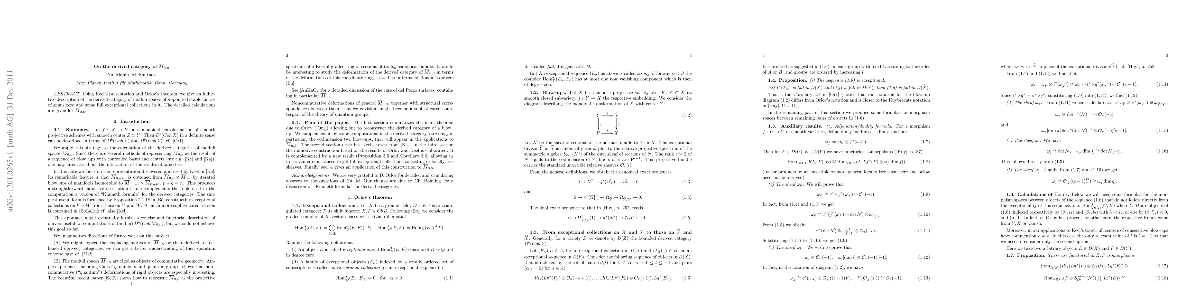 Using Keel's presentation and Orlov's theorem, we give an inductive description of the derived category of moduli spaces of $n$--pointed stable curves of genus zero and some full exceptional collections in it. The detailed calculations are given for $\bar{M}_{0,6}$.