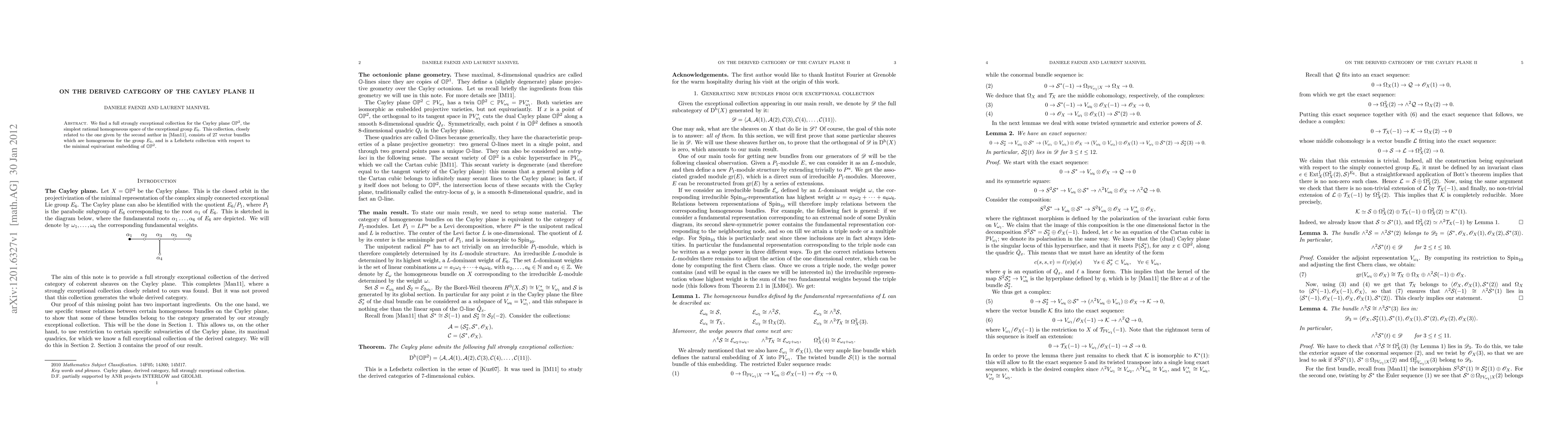 We find a full strongly exceptional collection for the Cayley plane OP2, the simplest rational homogeneous space of the exceptional group E6. This collection, closely related to the one given by the second author in [J. Algebra, 330:177-187, 2011], consists of 27 vector bundles which are homogeneous for the group E6, and is a Lefschetz collection with respect to the minimal equivariant embedding of OP2.
