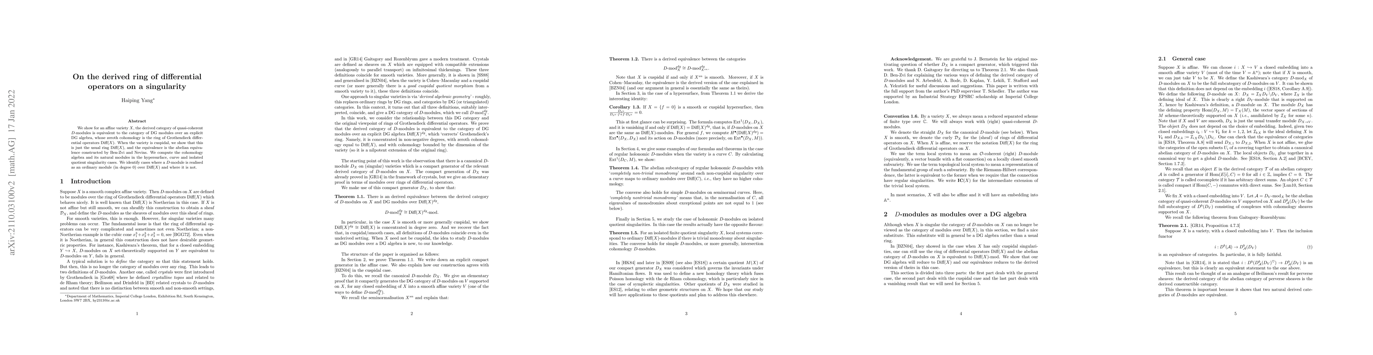 We show for an affine variety $X$, the derived category of quasi-coherent $D$-modules is equivalent to the category of DG modules over an explicit DG algebra, whose zeroth cohomology is the ring of Grothendieck differential operators $\operatorname{Diff}(X)$. When the variety is cuspidal, we show that this is just the usual ring $\operatorname{Diff}(X)$, and the equivalence is the abelian equivalence constructed by Ben-Zvi and Nevins. We compute the cohomology algebra and its natural modules in the hypersurface, curve and isolated quotient singularity cases. We identify cases where a $D$-module is realised as an ordinary module (in degree 0) over $\operatorname{Diff}(X)$ and where it is not.