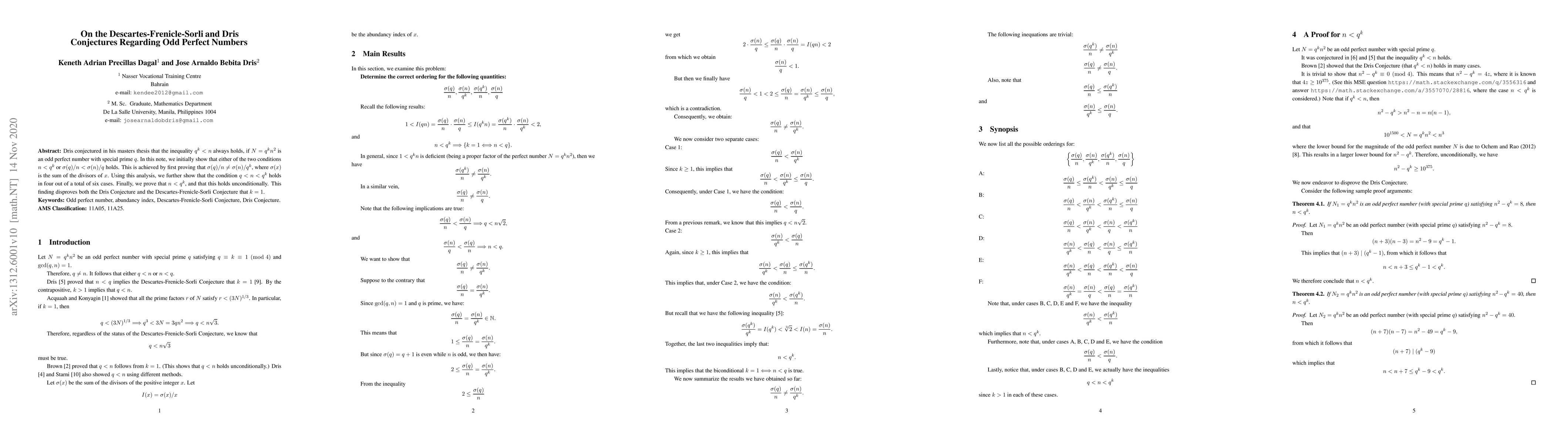 Dris conjectured in his masters thesis that the inequality $q^k < n$ always holds, if $N = {q^k}{n^2}$ is an odd perfect number with special prime $q$. In this note, we initially show that either of the two conditions $n < q^k$ or $\sigma(q)/n < \sigma(n)/q$ holds. This is achieved by first proving that $\sigma(q)/n \neq \sigma(n)/q^k$, where $\sigma(x)$ is the sum of the divisors of $x$. Using this analysis, we further show that the condition $q < n < q^k$ holds in four out of a total of six cases. Finally, we prove that $n < q^k$, and that this holds unconditionally. This finding disproves both the Dris Conjecture and the Descartes-Frenicle-Sorli Conjecture that $k = 1$.