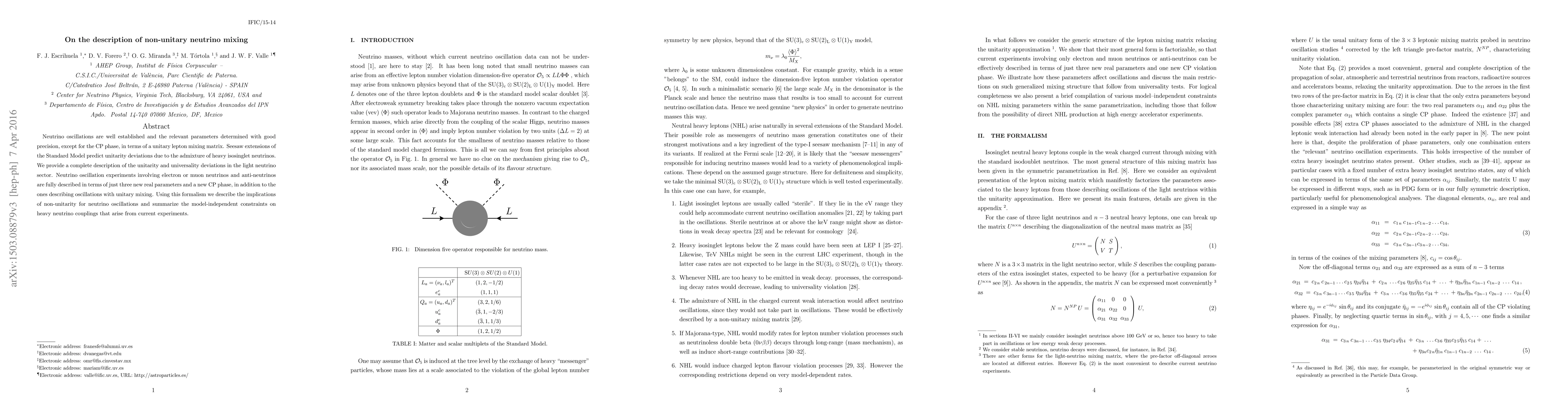 This paper provides a comprehensive description of non-unitary neutrino mixing, introducing three new real parameters and a CP phase to account for deviations from unitarity predicted by seesaw mechanisms. It also outlines the implications for neutrino oscillation experiments and the constraints on heavy neutrino couplings derived from current data.