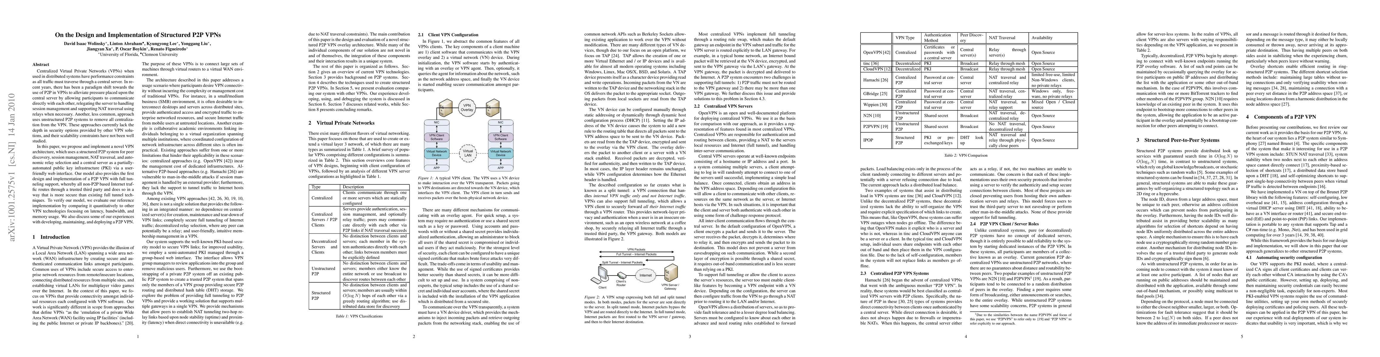 This paper proposes a structured P2P VPN architecture that leverages a P2P system for peer discovery and NAT traversal while using a central server for PKI management, offering enhanced security and full tunneling. The authors implement and evaluate their model, comparing it to other VPN technologies on metrics like latency, bandwidth, and memory usage.