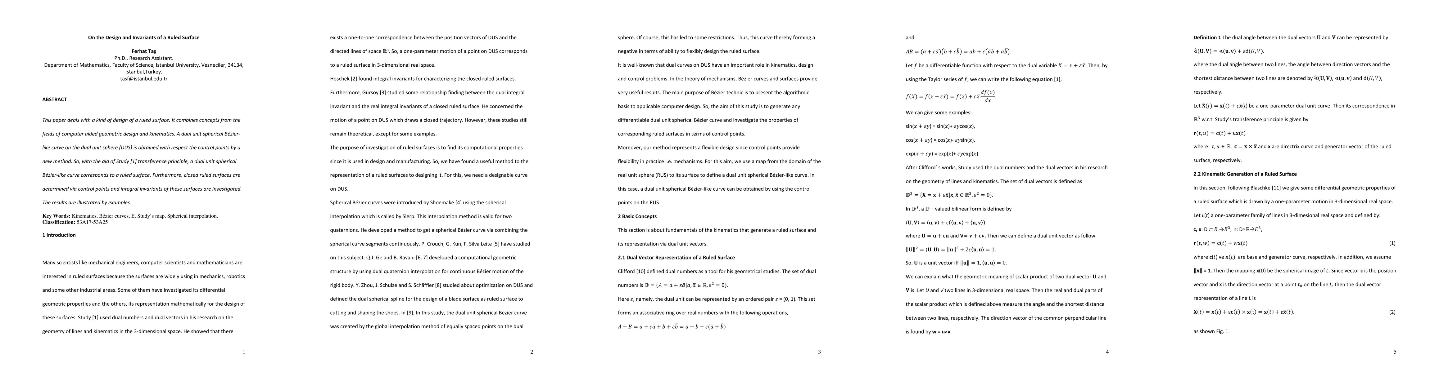 This paper deals with a kind of design of a ruled surface. It combines concepts from the fields of computer aided geometric design and kinematics. A dual unit spherical B\'ezier-like curve on the dual unit sphere (DUS) is obtained with respect the control points by a new method. So, with the aid of Study [1] transference principle, a dual unit spherical B\'ezier-like curve corresponds to a ruled surface. Furthermore, closed ruled surfaces are determined via control points and integral invariants of these surfaces are investigated. The results are illustrated by examples.
