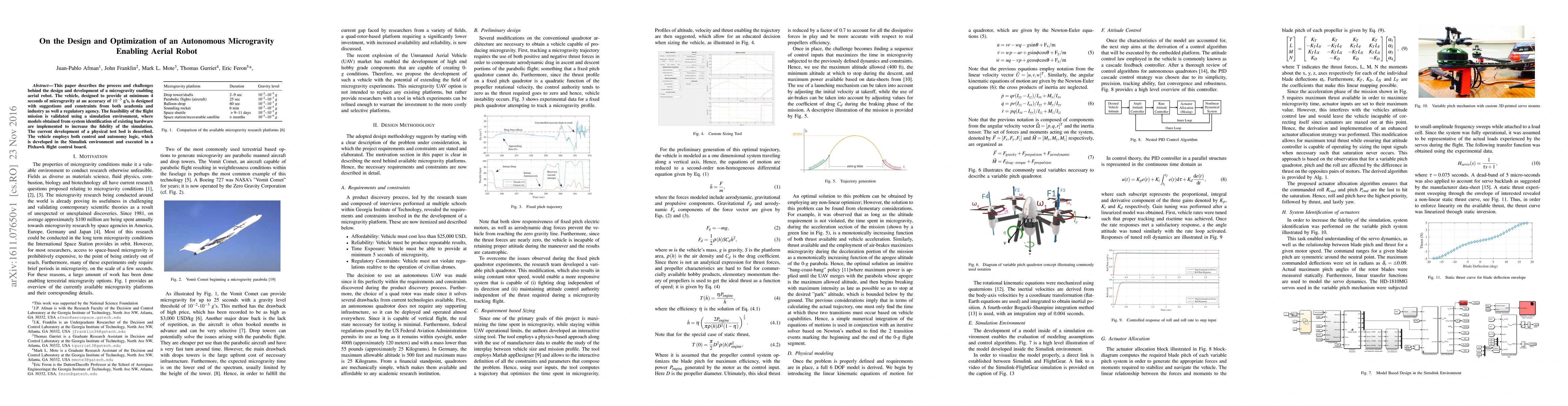 This paper describes the process and challenges behind the design and development of a micro-gravity enabling aerial robot. The vehicle, designed to provide at minimum 4 seconds of micro-gravity at an accuracy of .001 g's, is designed with suggestions and constraints from both academia and industry as well a regulatory agency. The feasibility of the flight mission is validated using a simulation environment, where models obtained from system identification of existing hardware are implemented to increase the fidelity of the simulation. The current development of a physical test bed is described. The vehicle employs both control and autonomy logic, which is developed in the Simulink environment and executed in a Pixhawk flight control board.