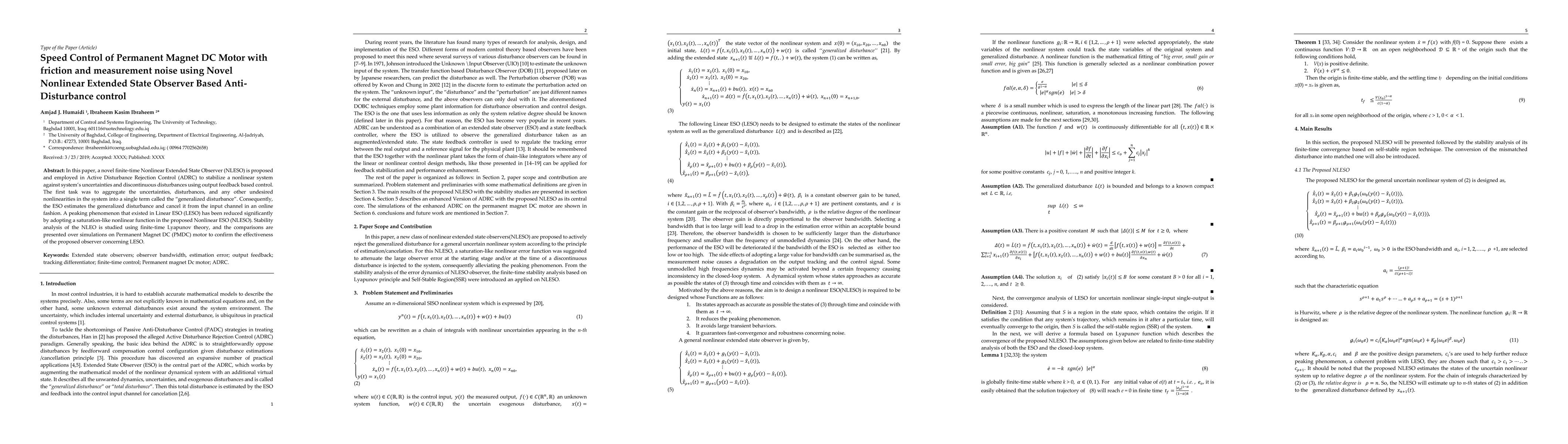 In this paper, a novel finite - time Nonlinear Extended State Observer (NLESO) is proposed and employed in Active Disturbance Rejection Control (ADRC) to stabilize a nonlinear system against system's uncertainties and discontinuous disturbances using output feedback technique. The first task was to aggregate the uncertainties, disturbances, and any other undesired nonlinearities in the system into a single term called the "generalized disturbance". Consequently, the ESO estimates the generalized disturbance and cancel it from the input channel in an online fashion. A peaking phenomenon that existed in Linear ESO (LESO) has been reduced significantly by adopting a saturation - like nonlinear function in the proposed Nonlinear ESO (NLESO). Stability analysis of the NLEO is studied using finite - time Lyapunov theory, and the comparisons are presented over simulations on Permanent Magnet DC (PMDC) motor to confirm the effectiveness of the proposed observer concerning LESO.
