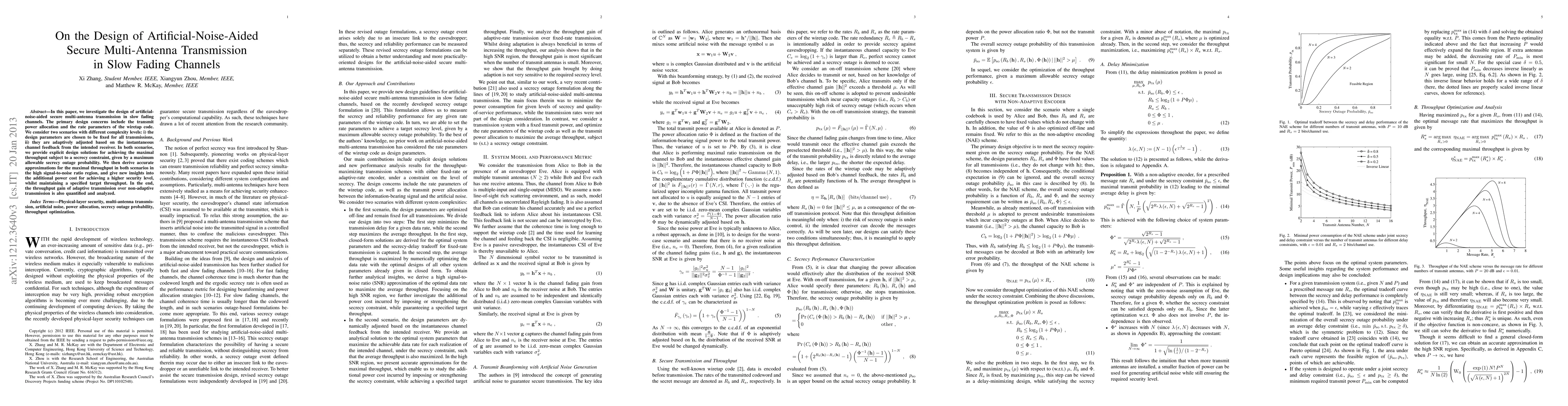 This paper explores the design of secure multi-antenna transmission using artificial noise in slow fading channels, focusing on transmit power allocation and rate parameters. It compares fixed and adaptive design strategies, providing solutions for maximal throughput under secrecy constraints, and quantifies the throughput gain of adaptive over non-adaptive methods.