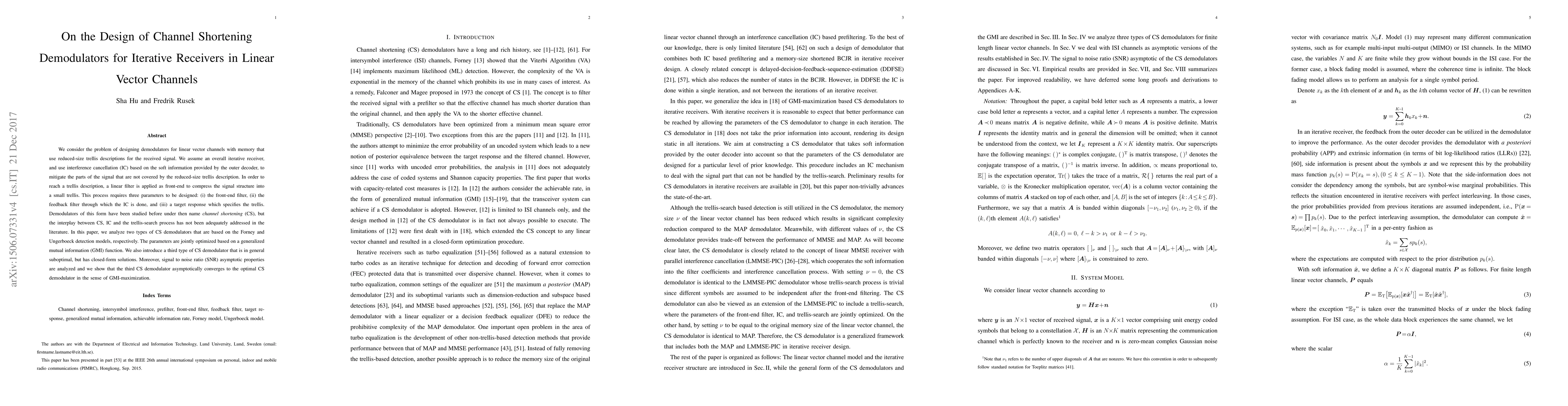 This paper presents a design for demodulators in MIMO and ISI channels using reduced-size trellis descriptions, combining channel shortening (CS) with interference cancellation. Two CS demodulator types are analyzed and optimized for generalized mutual information (GMI), with a third, asymptotically optimal demodulator provided in closed form. SNR asymptotic properties are also examined.