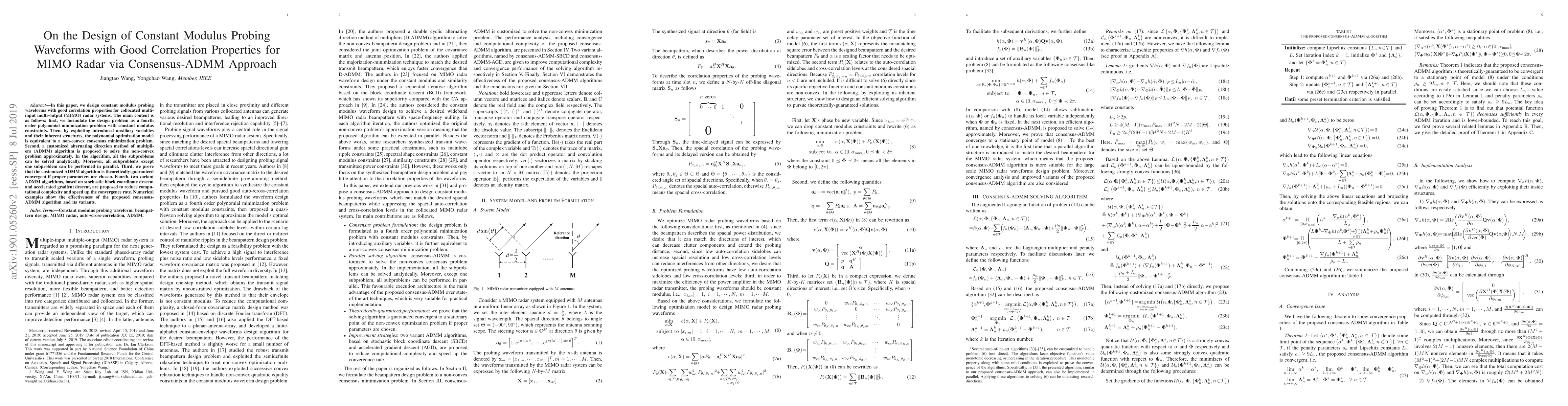 This paper designs constant modulus probing waveforms for MIMO radar systems by formulating a polynomial minimization problem and solving it via a customized ADMM algorithm. The proposed method ensures convergence and allows for parallel computation, with variants enhancing computational efficiency.