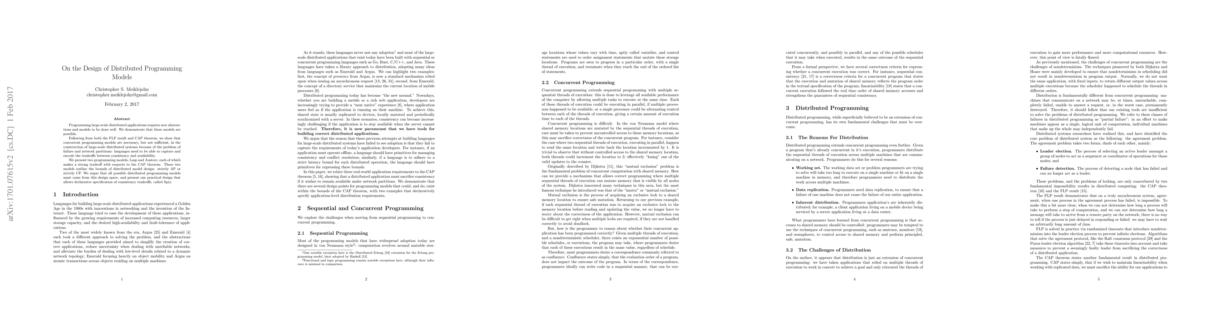 Programming large-scale distributed applications requires new abstractions and models to be done well. We demonstrate that these models are possible. Following from both the FLP result and CAP theorem, we show that concurrent programming models are necessary, but not sufficient, in the construction of large-scale distributed systems because of the problem of failure and network partitions: languages need to be able to capture and encode the tradeoffs between consistency and availability. We present two programming models, Lasp and Austere, each of which makes a strong tradeoff with respects to the CAP theorem. These two models outline the bounds of distributed model design: strictly AP or strictly CP. We argue that all possible distributed programming models must come from this design space, and present one practical design that allows declarative specification of consistency tradeoffs, called Spry.