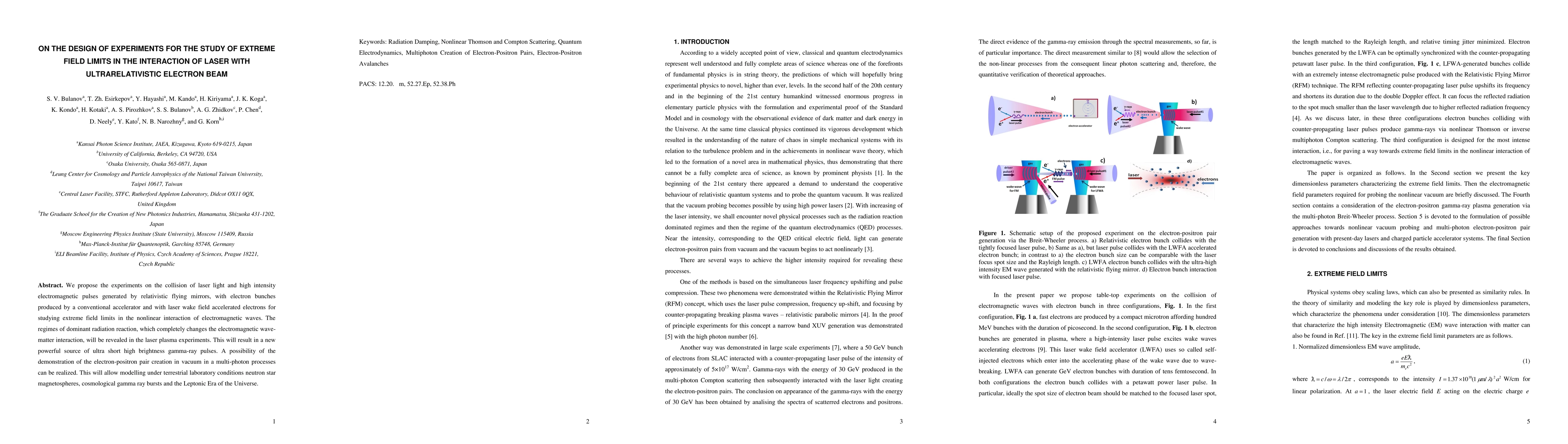 We propose the experiments on the collision of laser light and high intensity electromagnetic pulses generated by relativistic flying mirrors, with electron bunches produced by a conventional accelerator and with laser wake field accelerated electrons for studying extreme field limits in the nonlinear interaction of electromagnetic waves. The regimes of dominant radiation reaction, which completely changes the electromagnetic wave-matter interaction, will be revealed in the laser plasma experiments. This will result in a new powerful source of ultra short high brightness gamma-ray pulses. A possibility of the demonstration of the electron-positron pair creation in vacuum in a multi-photon processes can be realized. This will allow modeling under terrestrial laboratory conditions neutron star magnetospheres, cosmological gamma ray bursts and the Leptonic Era of the Universe.