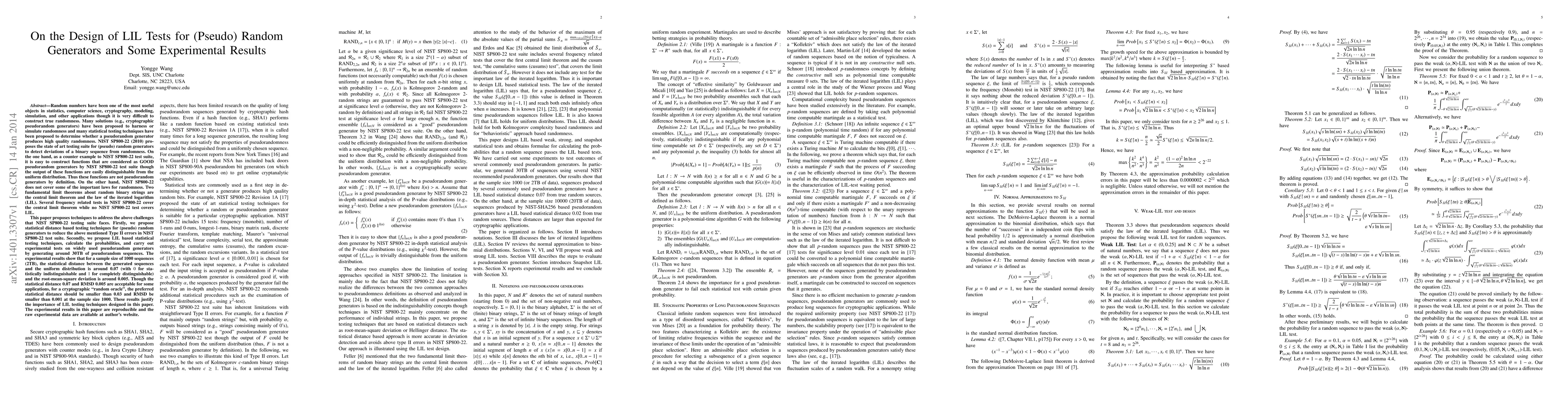 NIST SP800-22 (2010) proposes the state of art testing suite for (pseudo) random generators to detect deviations of a binary sequence from randomness. On the one hand, as a counter example to NIST SP800-22 test suite, it is easy to construct functions that are considered as GOOD pseudorandom generators by NIST SP800-22 test suite though the output of these functions are easily distinguishable from the uniform distribution. Thus these functions are not pseudorandom generators by definition. On the other hand, NIST SP800-22 does not cover some of the important laws for randomness. Two fundamental limit theorems about random binary strings are the central limit theorem and the law of the iterated logarithm (LIL). Several frequency related tests in NIST SP800-22 cover the central limit theorem while no NIST SP800-22 test covers LIL. This paper proposes techniques to address the above challenges that NIST SP800-22 testing suite faces. Firstly, we propose statistical distance based testing techniques for (pseudo) random generators to reduce the above mentioned Type II errors in NIST SP800-22 test suite. Secondly, we propose LIL based statistical testing techniques, calculate the probabilities, and carry out experimental tests on widely used pseudorandom generators by generating around 30TB of pseudorandom sequences. The experimental results show that for a sample size of 1000 sequences (2TB), the statistical distance between the generated sequences and the uniform distribution is around 0.07 (with $0$ for statistically indistinguishable and $1$ for completely distinguishable) and the root-mean-square deviation is around 0.005.