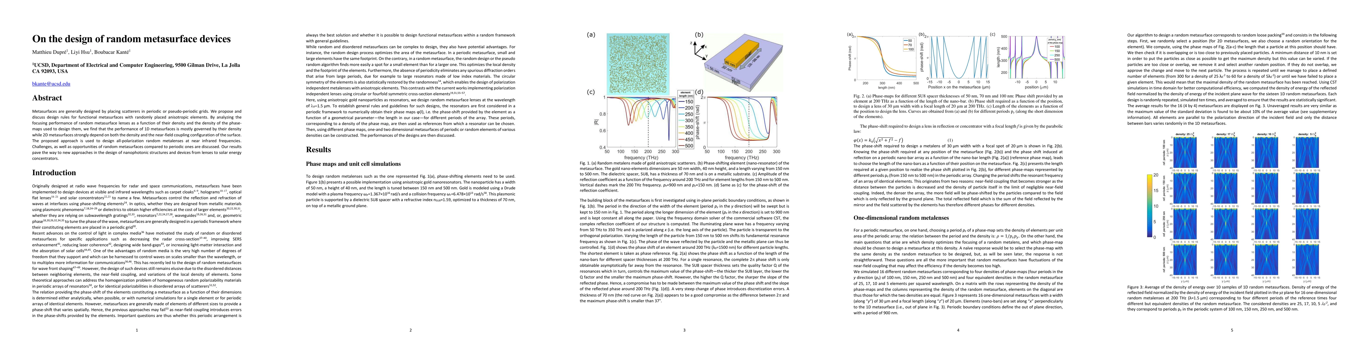 Metasurfaces are generally designed by placing scatterers in periodic or pseudo-periodic grids. We propose and discuss design rules for functional metasurfaces with randomly placed anisotropic elements. By analyzing the focusing performance of random metasurface lenses as a function of their density and the density of the phase-maps used to design them, we find that the performance of 1D metasurfaces is mostly governed by their density while 2D metasurfaces strongly depend on both the density and the near-field coupling configuration of the surface. The proposed approach is used to design all-polarization random metalenses at near infrared frequencies. Challenges, as well as opportunities of random metasurfaces compared to periodic ones are discussed. Our results pave the way to new approaches in the design of nanophotonic structures and devices from lenses to solar energy concentrators.