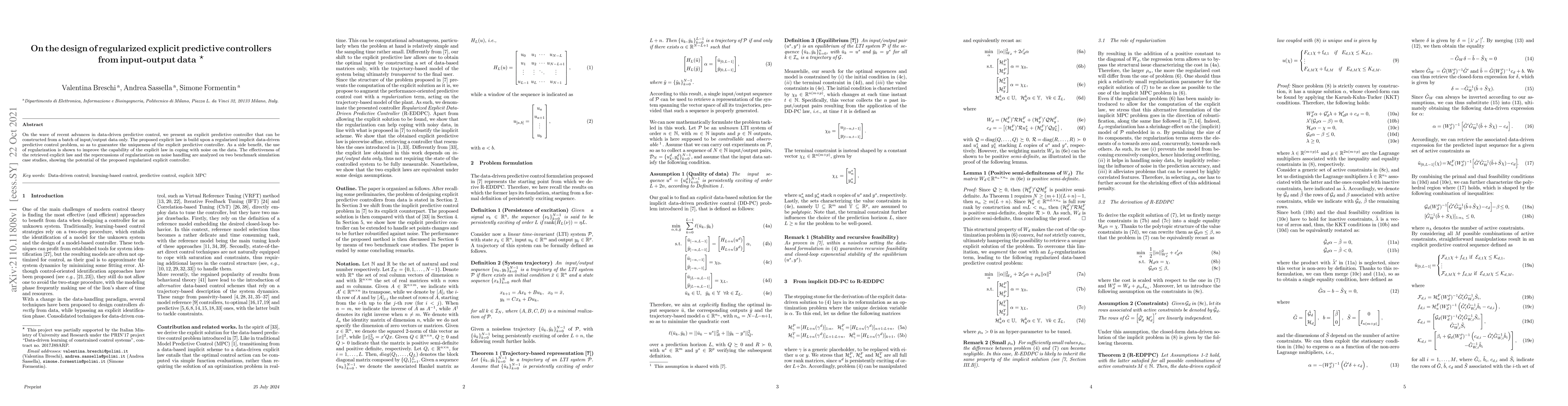 This paper proposes a regularized explicit predictive controller designed from input-output data, ensuring uniqueness and improved noise handling through regularization. The effectiveness is demonstrated through benchmark simulations.