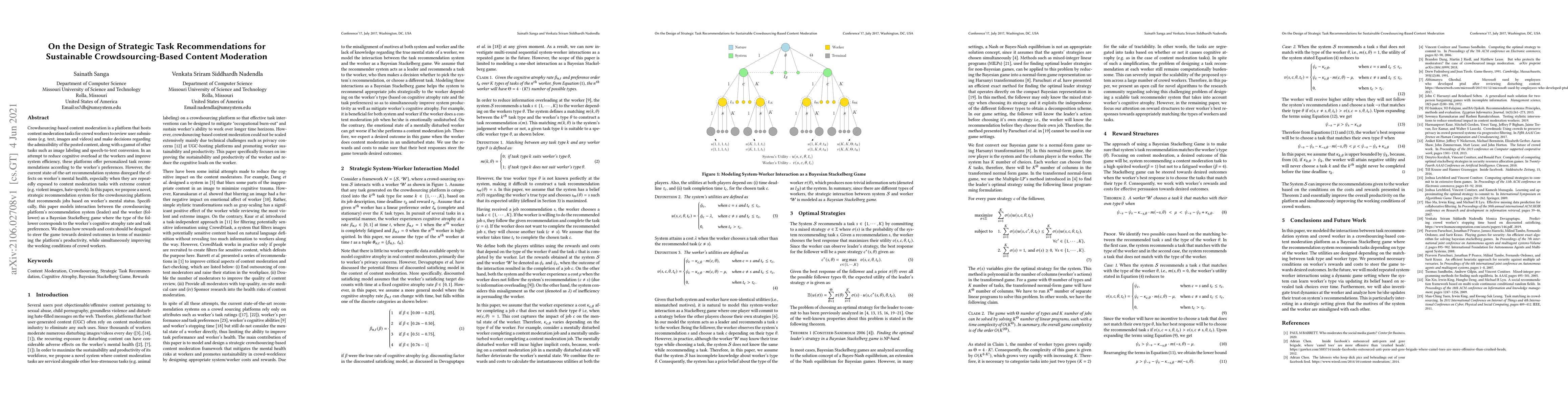 Crowdsourcing-based content moderation is a platform that hosts content moderation tasks for crowd workers to review user submissions (e.g. text, images and videos) and make decisions regarding the admissibility of the posted content, along with a gamut of other tasks such as image labeling and speech-to-text conversion. In an attempt to reduce cognitive overload at the workers and improve system efficiency, these platforms offer personalized task recommendations according to the worker's preferences. However, the current state-of-the-art recommendation systems disregard the effects on worker's mental health, especially when they are repeatedly exposed to content moderation tasks with extreme content (e.g. violent images, hate-speech). In this paper, we propose a novel, strategic recommendation system for the crowdsourcing platform that recommends jobs based on worker's mental status. Specifically, this paper models interaction between the crowdsourcing platform's recommendation system (leader) and the worker (follower) as a Bayesian Stackelberg game where the type of the follower corresponds to the worker's cognitive atrophy rate and task preferences. We discuss how rewards and costs should be designed to steer the game towards desired outcomes in terms of maximizing the platform's productivity, while simultaneously improving the working conditions of crowd workers.