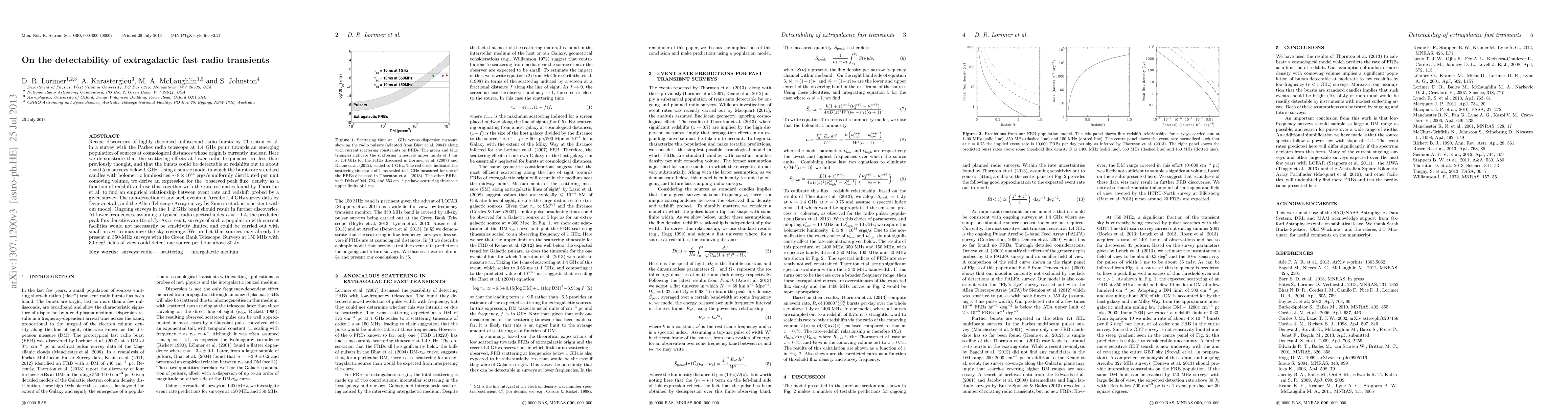 Recent discoveries of highly dispersed millisecond radio bursts by Thornton et al. in a survey with the Parkes radio telescope at 1.4 GHz point towards an emerging population of sources at cosmological distances whose origin is currently unclear. Here we demonstrate that the scattering effects at lower radio frequencies are less than previously thought, and that the bursts could be detectable at redshifts out to about $z=0.5$ in surveys below 1 GHz. Using a source model in which the bursts are standard candles with bolometric luminosities $\sim 8 \times 10^{44}$ ergs/s uniformly distributed per unit comoving volume, we derive an expression for the observed peak flux density as a function of redshift and use this, together with the rate estimates found by Thornton et al. to find an empirical relationship between event rate and redshift probed by a given survey. The non-detection of any such events in Arecibo 1.4 GHz survey data by Deneva et al., and the Allen Telescope Array survey by Simeon et al. is consistent with our model. Ongoing surveys in the 1--2 GHz band should result in further discoveries. At lower frequencies, assuming a typical radio spectral index $\alpha=-1.4$, the predicted peak flux densities are 10s of Jy. As a result, surveys of such a population with current facilities would not necessarily be sensitivity limited and could be carried out with small arrays to maximize the sky coverage. We predict that sources may already be present in 350-MHz surveys with the Green Bank Telescope. Surveys at 150 MHz with 30 deg$^2$ fields of view could detect one source per hour above 30 Jy.