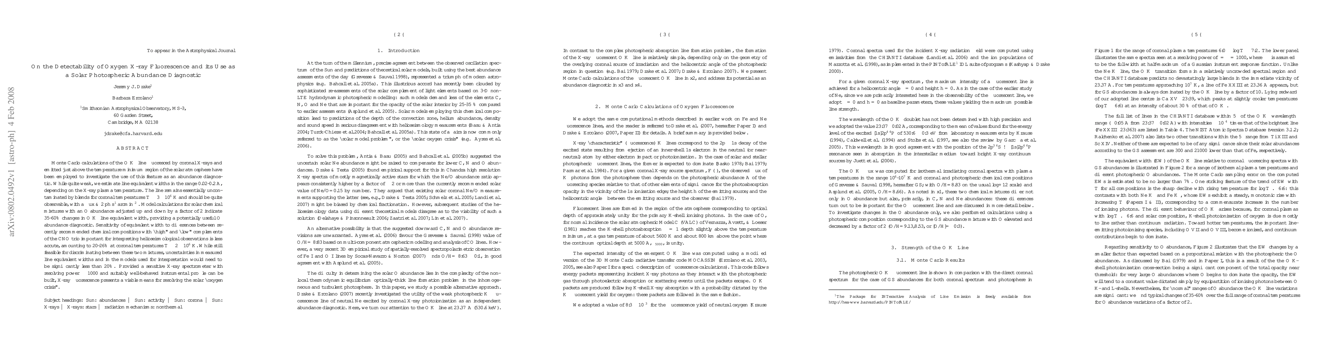 This paper investigates the detectability of the O Kalpha line in solar photospheric X-ray fluorescence, estimating its equivalent width and potential as an abundance diagnostic. The study suggests that while the line is weak, it could be observable and provides a useful method for determining solar oxygen abundance, with significant changes in equivalent width corresponding to variations in oxygen content.
