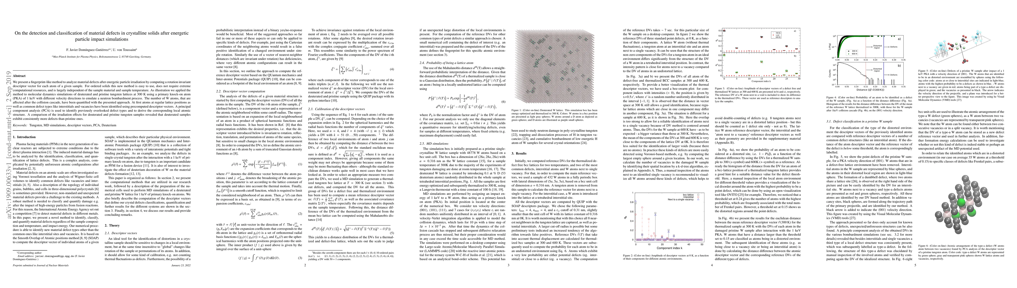 This research introduces a method to detect and classify material defects in crystalline solids after high-energy particle impact using a rotation-invariant descriptor vector for each atom. Applied to tungsten at 300K, it identified common defects and revealed deuterated tungsten samples had more defects post-irradiation than pristine ones.