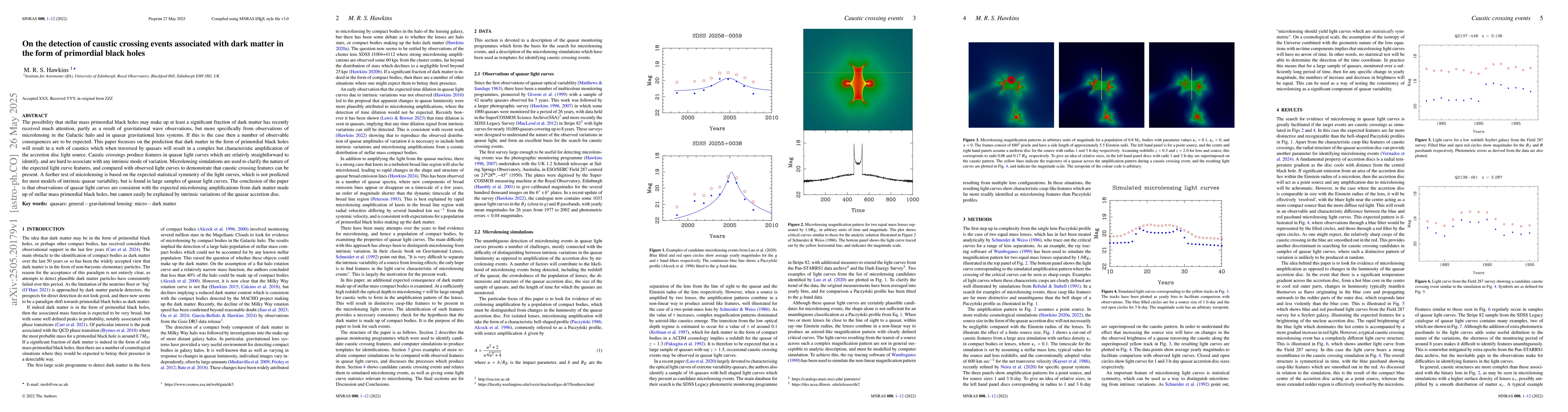 The paper uses microlensing simulations to clarify expected light curve features from caustic crossings caused by dark matter in the form of primordial black holes, comparing them with observed quasar light curves.