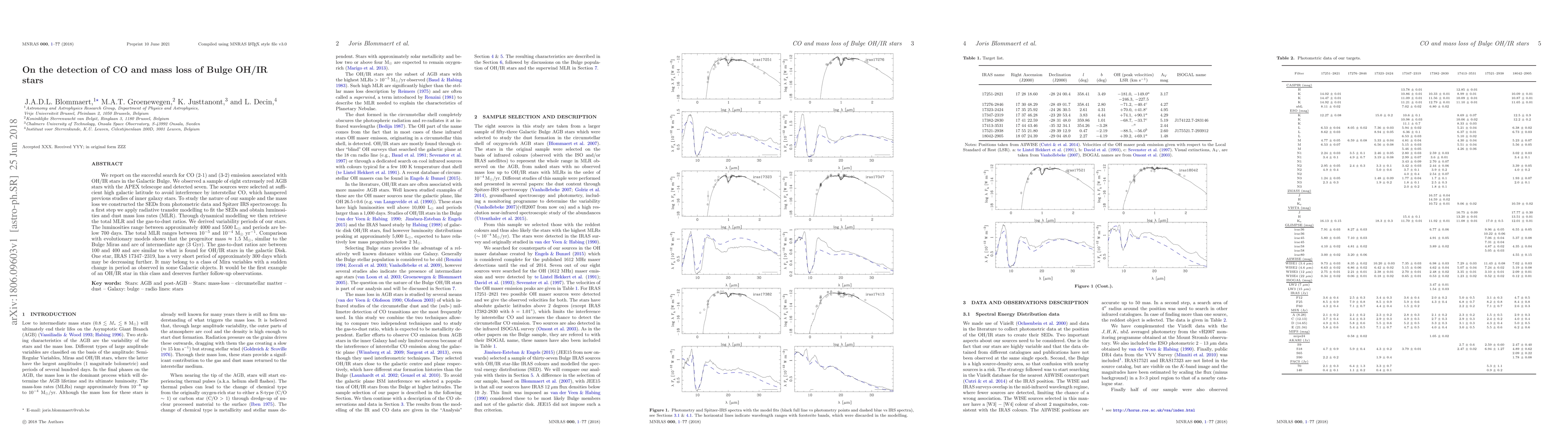 We report on the succesful search for CO (2-1) and (3-2) emission associated with OH/IR stars in the Galactic Bulge. We observed a sample of eight extremely red AGB stars with the APEX telescope and detected seven. The sources were selected at sufficient high galactic latitude to avoid interference by interstellar CO, which hampered previous studies of inner galaxy stars. To study the nature of our sample and the mass loss we constructed the SEDs from photometric data and Spitzer IRS spectroscopy. In a first step we apply radiative transfer modelling to fit the SEDs and obtain luminosities and dust mass loss rates (MLR). Through dynamical modelling we then retrieve the total MLR and the gas-to-dust ratios. We derived variability periods of our stars. The luminosities range between approximately 4000 and 5500 Lsun and periods are below 700 days. The total MLR ranges between 1E-5 and 1E-4 Msun/yr. Comparison with evolutionary models shows that the progenitor mass is approximately 1.5 Msun, similar to the Bulge Miras and are of intermediate age (3 Gyr). The gas-to-dust ratios are between 100 and 400 and are similar to what is found for OH/IR stars in the galactic Disk. One star, IRAS 17347-2319, has a very short period of approximately 300 days which may be decreasing further. It may belong to a class of Mira variables with a sudden change in period as observed in some Galactic objects. It would be the first example of an OH/IR star in this class and deserves further follow-up observations.