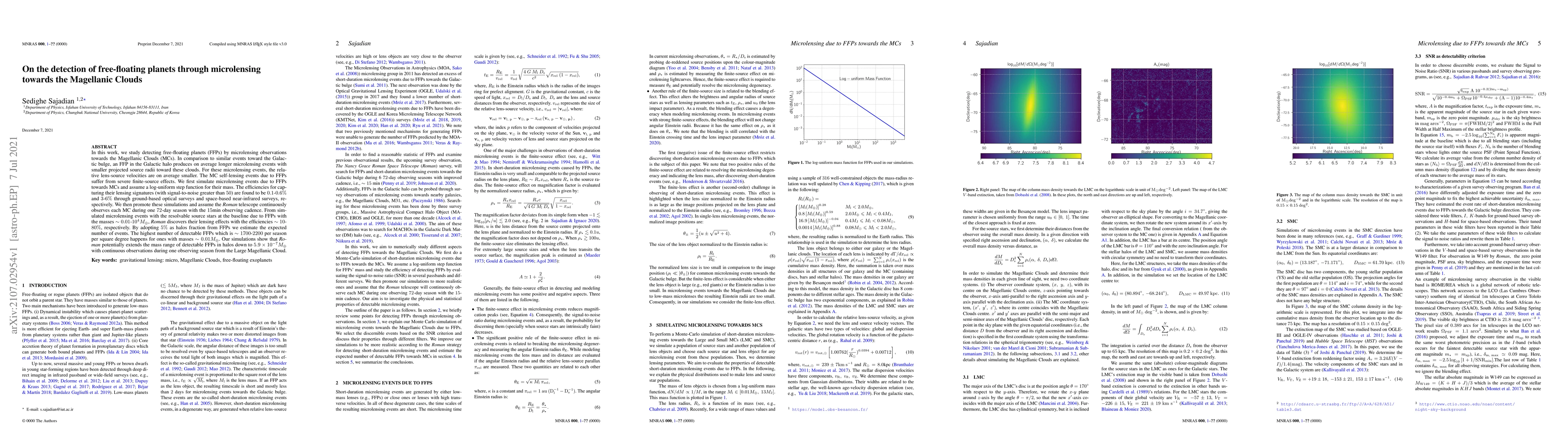 This research investigates the detection of free-floating planets (FFPs) via microlensing towards the Magellanic Clouds, finding that FFPs in the Galactic halo produce longer microlensing events compared to the Galactic bulge. Simulations show that ground-based and space-based surveys can detect FFPs with varying efficiencies, and the \wfirst~telescope could potentially detect FFPs down to masses of $5.9\times 10^{-7} M_{\oplus}$ over a 72-day season, with up to 2200 detectable events per square degree for the smallest masses.